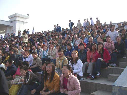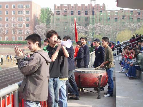 锣鼓震天向,面对运动场上的火爆场面,国贸系的拉拉队员们奋力高喊。运动员在赛场上挥洒汗水,他们在看台上呐喊助威,他们用肯定的目光,热烈的掌声,迎接运动员们的凯旋。一位拉拉队员激动不已地说:“能够为自己的队员加油,鼓劲,看到他们奋力拼搏,赢得桂冠时,我们也感到无比骄傲。”