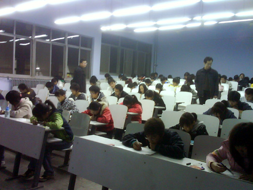 11月14日晚7:00,国贸系第四期业余党校结业考试在教学三号楼110室和210室进行,历时100分钟,187名业余党校学员参加了本次考试,王超、秦童、李海雷、谢波四位辅导员老师负责本次监考工作,系党总支副书记张小雁在05级党支部书记孙永杰的陪同下亲临考场指导工作。