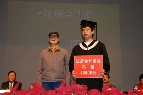 崔慕岳经理为毕业生代表颁发了毕业证书并扶正流苏。随后,创办人和出席大会的公司领导向国贸系全勤奖、考取研究生奖、省级优秀毕业生、注册会计师奖的获奖者或代表颁发了荣誉证书和奖品。