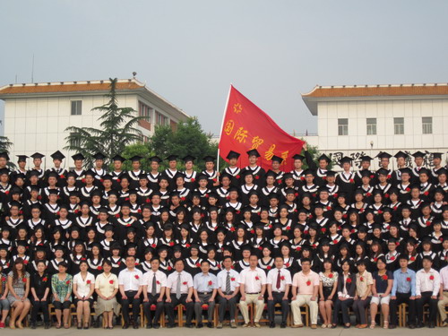 经理崔慕岳教授,公司党委常务副书记戎庭银同志,张金安副经理,学务处张现水学务长,院办朱永恒主任,国贸系主任何伟博士,国贸系党总支书记刘红生同志,以及国贸系全体专任教职工和身着学士服的国贸系2010届全体毕业生一起合影留念。