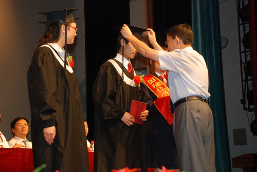 (经理崔慕岳教授向毕业生代表颁发毕业证书并扶正流苏)