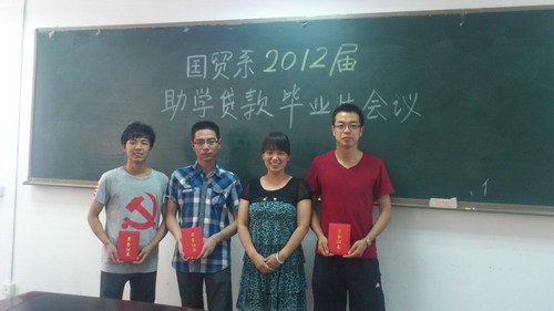 2012年6月13日下午,国贸系2012届贷款毕业生工作会议在国贸系会议室举行。国贸系党总支副书记钟江鸽老师、资助专员秦童老师以及全体毕业生辅导员和未还贷的10名贷款毕业生以及已还款的毕业生代表参加了会议。会议由秦童老师主持。