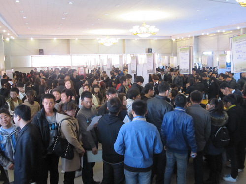 上午九点,龙湖报告厅内人头攒动,用人单位和毕业生双选活动开始。毕业生们手拿一叠个人简历,仔细地斟酌着每一个单位,当看到与自己专业对口的单位时则迫不及待地递上自己的简历,谨慎而紧张地等待对方的回应。用人单位根据员工简历情况在现场进行了简短的面试。部分用人单位前面还排起了长龙。