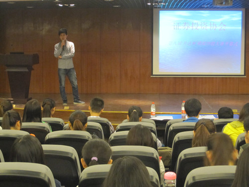 接着,证券投资协会的前任社长郭平对中国资本市场的现状进行分析,使同学们大致了解了目前证券投资市场环境。其后,杨进学长就中美股市进行对比、中国股市情况等问题做出讲解并提出自己的看法和经验,其生动形象的语言使大家都兴致勃勃、吸收的也更加透彻。最后,证券投资协会的现任社长王伟回顾历届模拟炒股大赛,并就大赛流程以及具体参赛事项作出详细讲解,解答了不少同学们心中的疑惑,使意向参赛的同学对比赛有了一个更加清晰的了解。此外他还慷慨的分享了自己的炒股历程,以供大家吸取教训、尽量避免失误、最终获得好成绩。最后,他还公布了社团统一账号,方便比赛过程中选手与举办方顺利交流,保证比赛圆满成功。