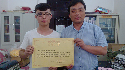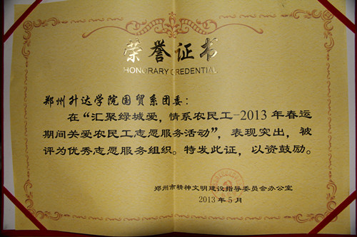 为树立典型、表彰先进,不断扩大关爱农民工志愿活动的覆盖面,努力营造理解、尊重和关爱农民工的浓厚社会氛围,国贸系团委志愿服务队在由郑州市志愿服务工作领导小组成员单位、各县(市)区文明办、各管委会文明办、市直文明办、各有关单位等共同开展的“汇聚绿城爱,情系农民工——2013年春运期间关爱农民工志愿服务活动”中表现突出,受到共青团郑州市委、郑州市精神文明建设指导委员会办公室的表彰,被授予“优秀志愿服务组织”。共青团郑州市委志愿者工作部副部长侯彦杰老师来院颁发了证书。