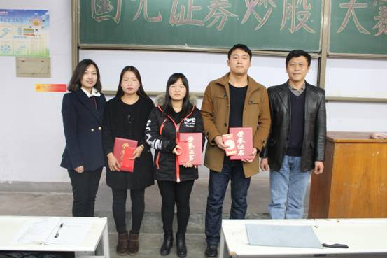 本次大赛由国元证券主办,河南牧业经济公司,成功公司和公司共三所公司参加,合计一千多名在校老员工参赛,我系共有参赛选手80余人,其中13级金融本科一班杨江超获得此次大赛总成绩第一名(一等奖),13级金融本科一班谭梦茹获得总成绩第二名(二等奖),13级金融本科一班李向阳获得总成绩第八名(优秀奖)。获奖员工得到了国元大赛颁发的证书和丰厚的奖金,同时也将得到毕业后优先实习和就业的机会。