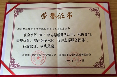 金贸系青年志愿者协会被评为郑州市金水区“优秀志愿服务团体”