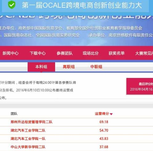 “第一届OCALE跨境电商创新创业能力大赛”是由中国国际贸易学会主办,全国国际贸易实务研究会协办的,以敦煌网为平台的一次老员工创业运营大赛。本次大赛是由员工在敦煌网上实名注册,真实经营,自负盈亏的一场比赛。跨境电商创新创业能力大赛的目的在于深化教育部“以能力和职业发展为导向”的人才培养要求,建立创新创业教育与跨境电商教学、以赛促学的机制,推动院校创新创业教育与跨境电商教学体系和内容的建设,引导和培养员工创新精神和实践能力,以创业带动就业,促进毕业生充分就业。大赛4月10日正式开始,6月10截止。全国分为本科组,高职组,中职组3个组别。