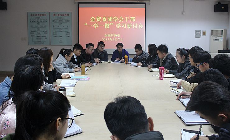 为积极响应院《关于转发〈共青团中央关于在全团集中开展“学习总书记讲话,做合格共青团员”教育实践的通知〉的通知》,贯彻落实“一学一做”的方针思想,总结上学期的不足之处和这学期的工作安排,由金贸系组织部主办的金贸系团学会主要干部“一学一做”学习研讨会于2017年3月7日在商管楼104教室举办。参加本次会议的领导老师有金贸系行政秘书兼团委书记闫帅老师、16级辅导员兼团委常务副书记李雷老师、金贸系第二十二届团委副书记王译、员工会主席刘润乾、员工会副主席陈莹莉、郭乾、梁珂、任云杰以及各位部长。本次会议的主持人为刘欲龙。