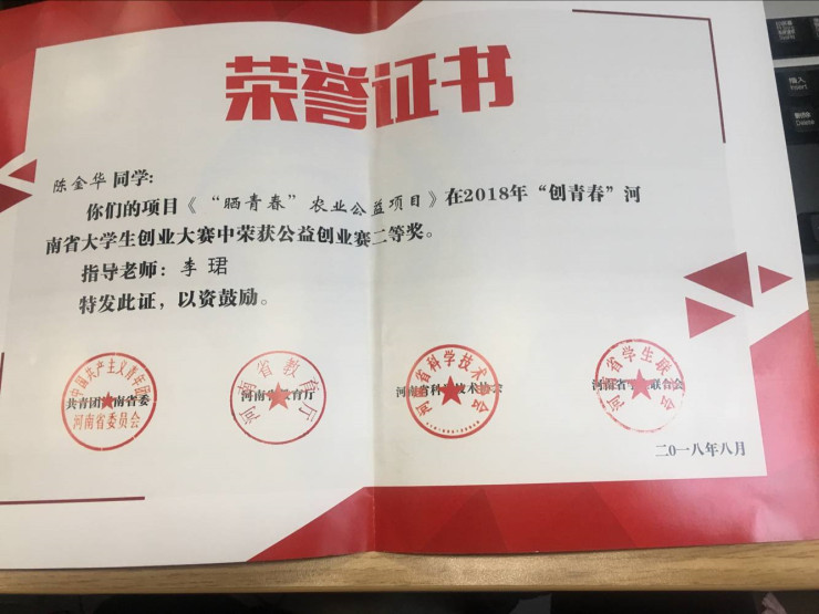 近日,由共青团中央、教育部、人力资源和社会保障部、中国科协、全国学联、浙江省人民政府主办,河南省承办的2018年“创青春”老员工创业大赛落下了帷幕。公司beats365唯一官方网站的《“晒青春”农业公益项目》在此次比赛中荣获公益创业赛省赛二等奖的佳绩。