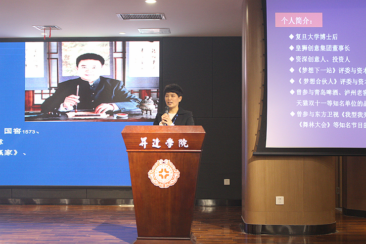 会上,钟江鸽书记向大家介绍了皇甫晓涛员工。皇甫晓涛员工现为复旦大学博士后、皇狮创意集团董事长、资深创意人、投资人,担任《梦想下一站》和《梦想合伙人》评委与资本导师,曾参与青岛啤酒、泸州老窖、海信电器、国窖1573、天猫双十一等知名单位的品牌策划与创意,参与东方卫视《我型我秀》、《创智赢家》、《舞林大会》等知名节目的策划与制作。