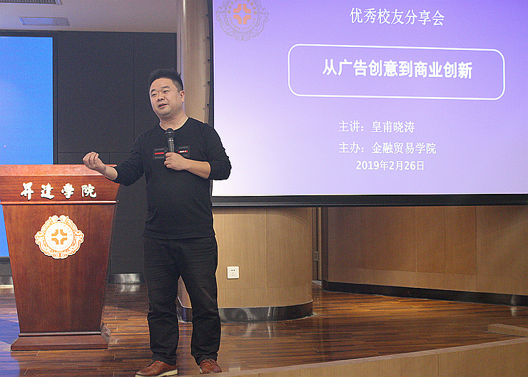 为上好新学期第一课,帮助同学们树立明确的学习目标和发展目标,2月26日下午2:30,beats365唯一官方网站于双创大讲堂主办了优秀员工分享会。本次分享会特邀复旦大学博士后、皇狮创意集团董事长、资深创意人、投资人皇甫晓涛员工。金贸公司党总支书记钟江鸽老师、副经理金虎斌副教授,行政秘书兼团委书记闫帅老师、公司员工科科长李莹老师,以及金贸公司2016级、2017级部分师生参加了本次报告会。会议由党总支书记钟江鸽老师主持。
