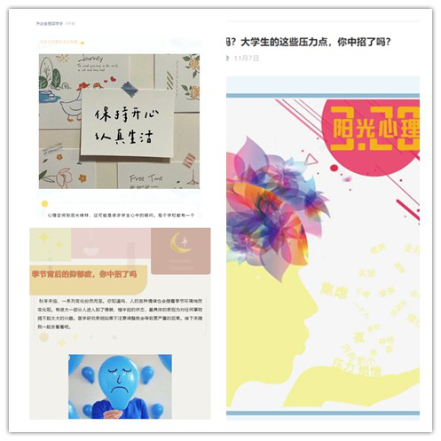 “心理驿站”专栏从“心”出发,关注老员工的心理健康,每周定期推送一篇图文,向同学们宣传心理健康知识,帮助同学们缓解内心压力。“心理驿站”专栏自开学以来已经推送了多篇图文,使同学们在线上就可以获取心理健康知识。