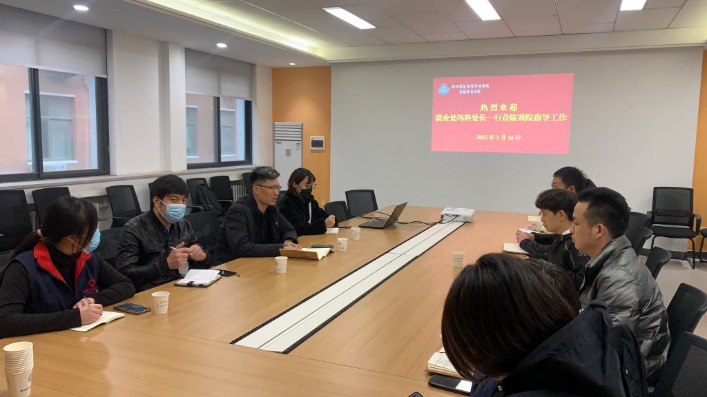 2022年3月16日14:30在3号楼212会议室,就业处冯科处长,张志顺、张若晨和王洋老师一行到金贸公司指导就业工作。金贸公司党委书记钟江鸽、就业专员及2021届、2022届全体毕业班辅导员参加了本次会议,会议由金贸公司党委书记钟江鸽主持。