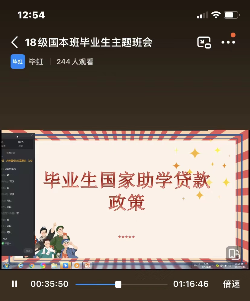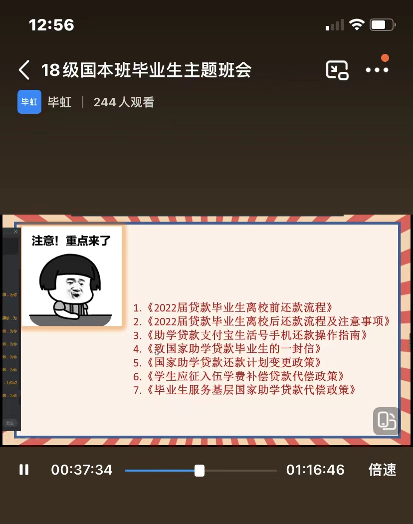 毕业班辅导员通过线上组织贷款毕业生学习《2022贷款毕业生离校前还款流程》《2022届贷款毕业生离校后还款流程及注意事项》,向每位贷款毕业生发放了《助学贷款支付宝生活号手机还款操作指南》、《致国家助学贷款毕业生一封信》,嘱咐员工牢记还款责任和日期按时还贷,勉励大家为下一届毕业生做好表率。