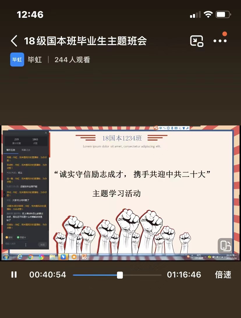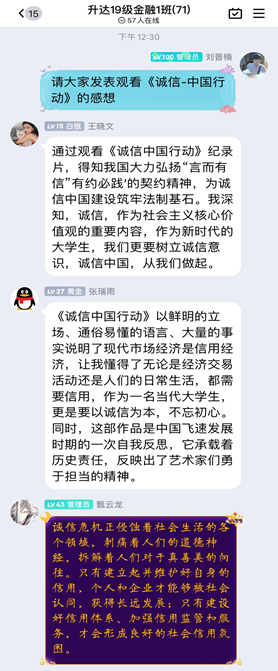 根据公司防疫政策要求,公司各年级通过线上组织诚信主题班会班会的内容丰富多彩,通过观影、诚信大讨论等环节来促进认识,引导员工在学习生活中宣扬诚信、践行诚信,在培养诚信意识和养成诚信习惯的过程中,重点开展“诚信人生、知恩感恩、爱国奋进、抗疫有我”的教育,在平时生活学习中要积极展现当代老员工良好的思想道德风貌。