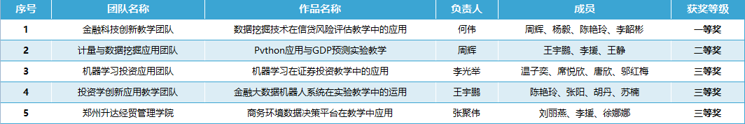公司将此项赛事作为近年来进行的专业数智化转型的检验平台,要求各课程群团队,排除疫情干扰,系统总结实践经验,努力提交高质量作品。公司在本次大赛中的获奖作品,涉及金融科技、数据挖掘、投资学和商务决策四个课程群团队,体现了公司各专业“融合化、交叉化、数智化”的改革方向,反映了公司教师队伍跨学科综合应用能力的不断提升,也为金融专业申硕提供了有力的支撑。