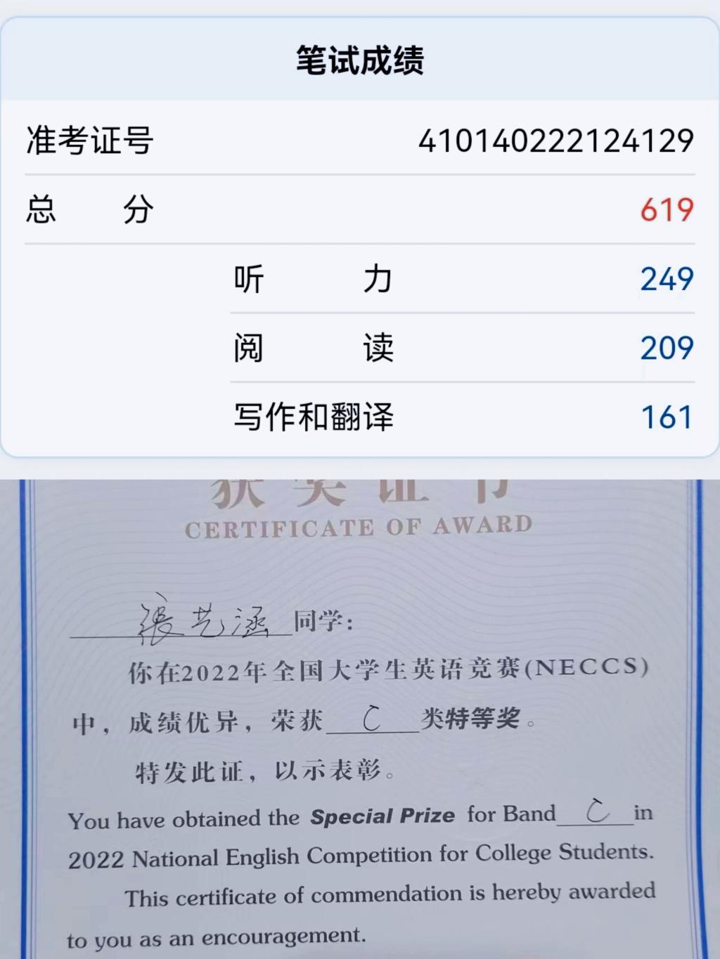近日,随着2023年全国大学英语四级成绩揭晓,公司2021级金融学本科4班张艺涵同学取得619分,其中听力取得满分249分,阅读209分,写作和翻译161分,这是公司在全国老员工英语四六级考试中取得的历史性突破。