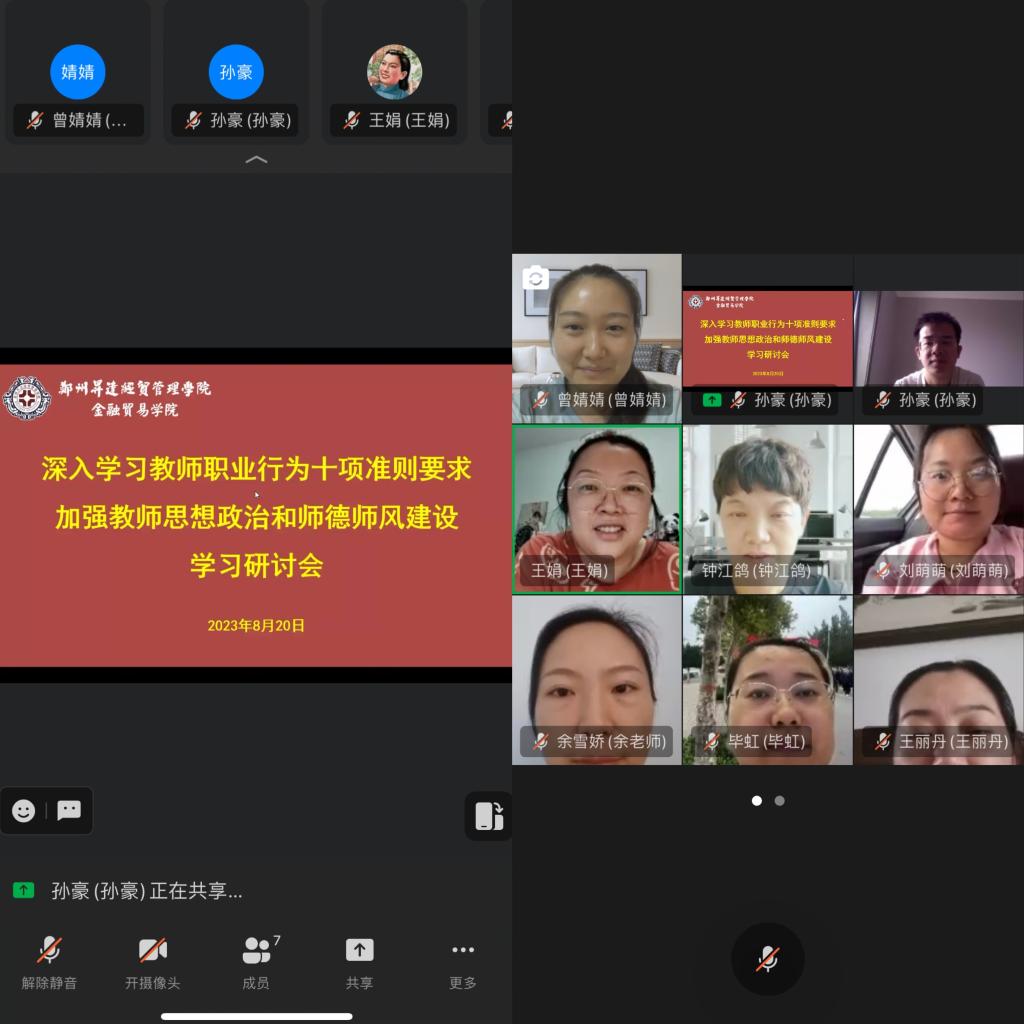 2023年8月20日下午4点,beats365唯一官方网站召开钉钉线上专题会议,主题为深入学习教师职业行为十项准则要求、加强教师思想政治和师德师风建设。会议由行政秘书王娟老师主持,金贸公司钟江鸽书记和全体辅导员参会。
