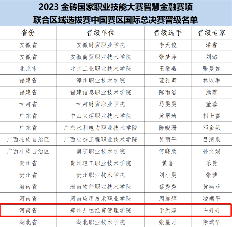 近日,金砖国家职业技能大赛-智慧金融赛项(赛项编号:BRICS-FS-39)联合区域选拔赛结果揭晓,公司学子2021级金融工程专业1班于洪森同学斩获佳绩并成功晋级中国赛区总决赛。
