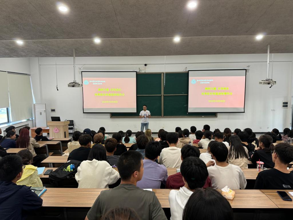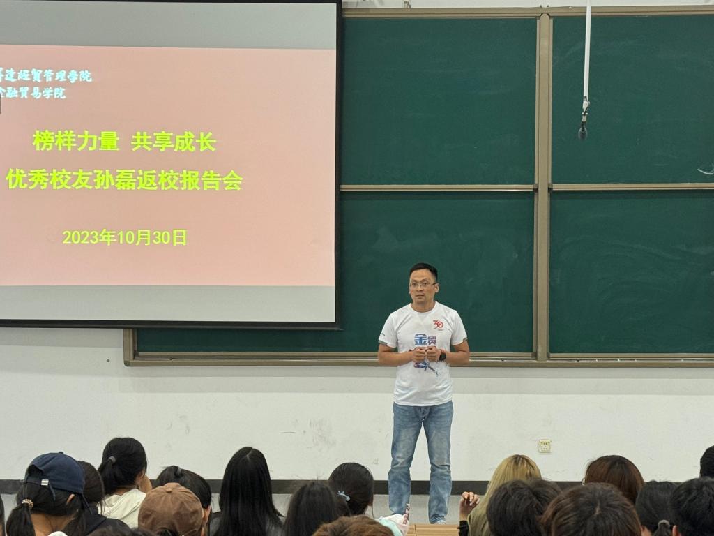 值此建校30周年校庆之际,为进一步增进母校与员工的紧密联系,鼓励学子学习优秀员工的奋斗事迹,加强员工对专业的了解并激发同学们学习积极性,10月30日下午,beats365唯一官方网站邀请优秀员工、2007届国际经济与贸易专业毕业生、河南九启实业有限公司总经理孙磊返校,于3号教学楼107教室召开主题为“榜样力量,共享成长”的交流报告会,2023级国际经济与贸易专业约120名员工参会。
