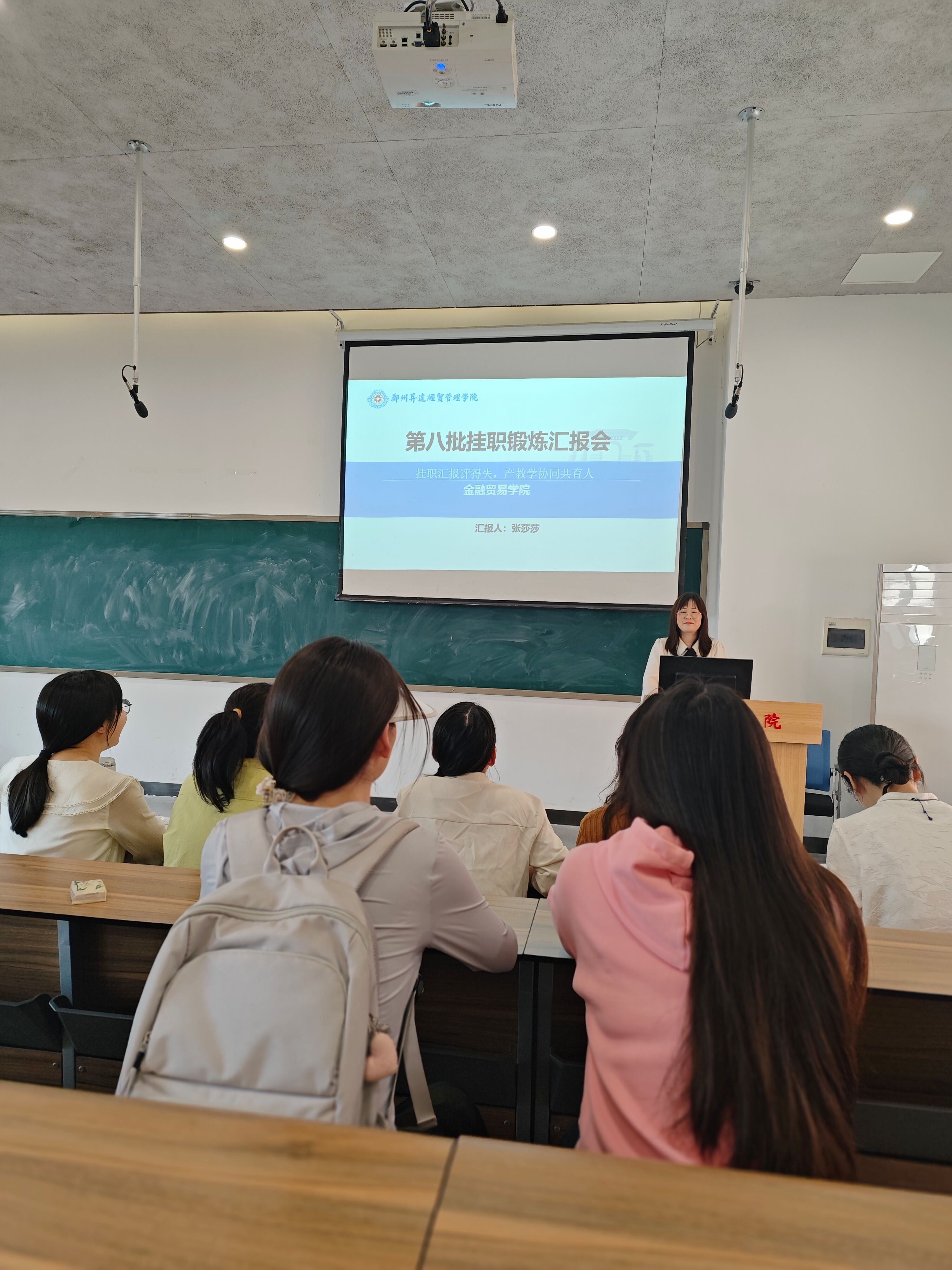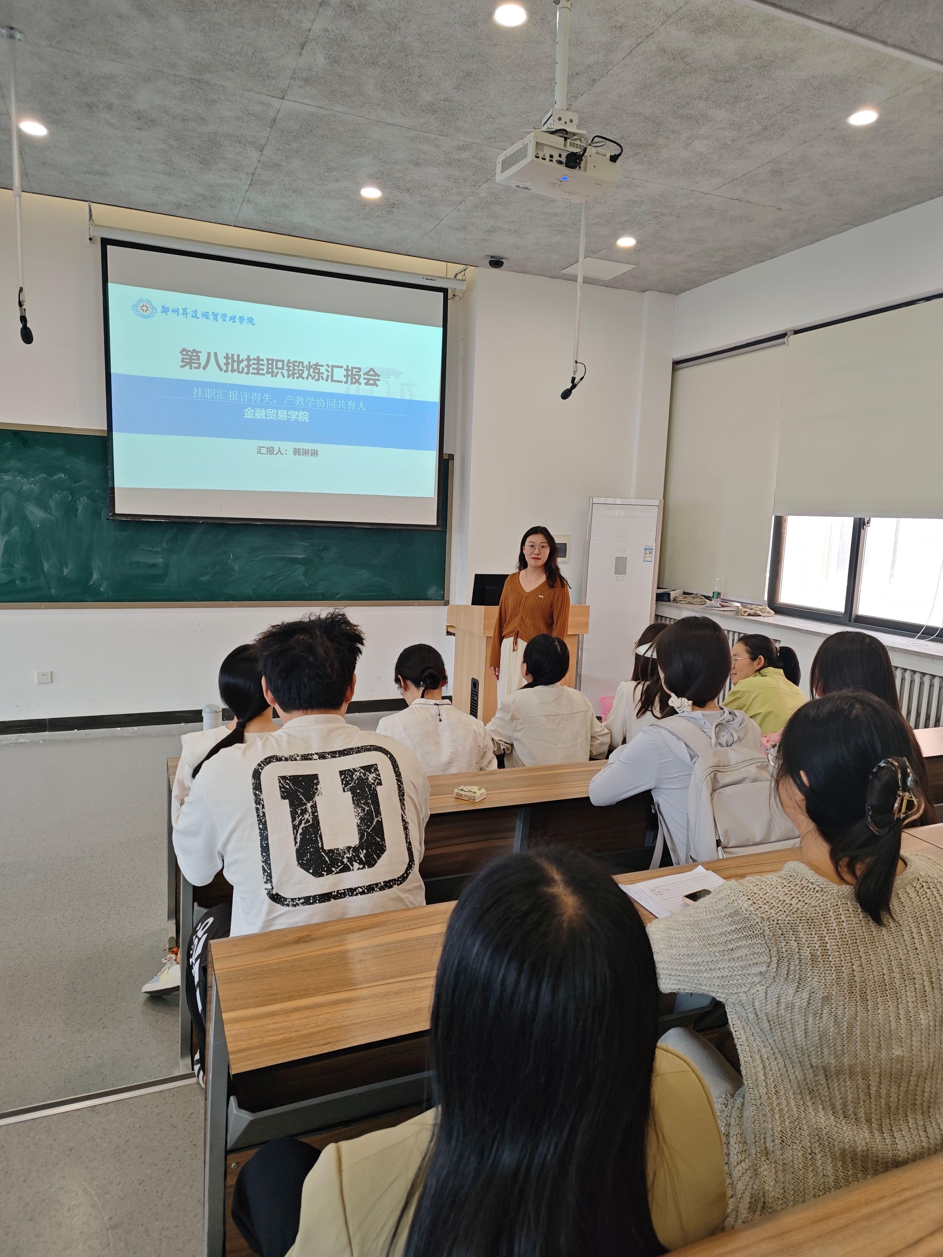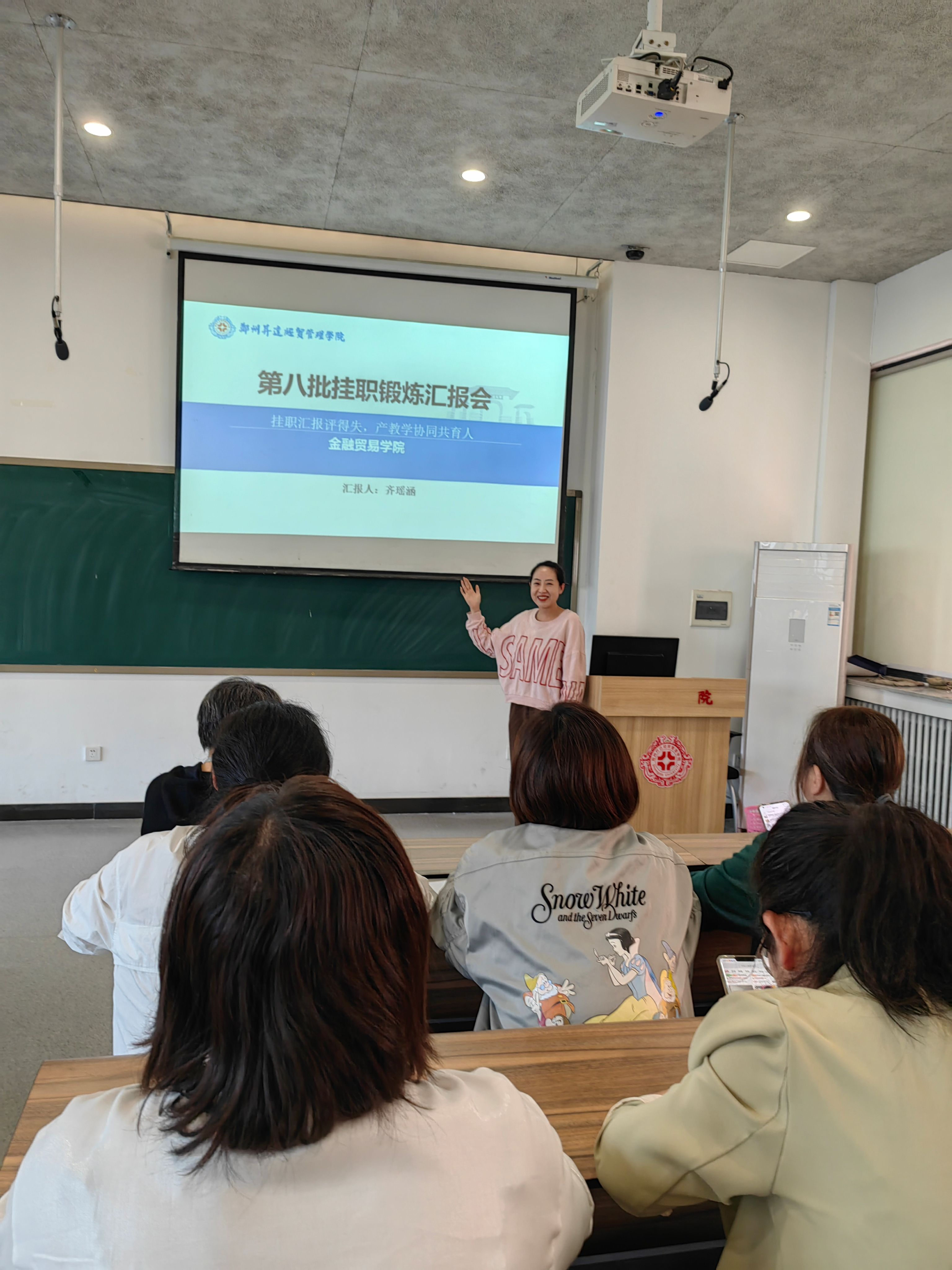 齐瑶涵老师分享了在河南铁字建筑工程有限公司挂职锻炼的经历。在该公司挂职期间主要在公司融资助理岗上完成企业融资相关工作,协助金融机构完成授信调查,落实公司融资方案等具体操作。通过企业挂职锻炼,获取企业金融融资的实际工作经验,将金融实务经验带回课堂,优化课堂教学案例,提升员工综合能力培养。