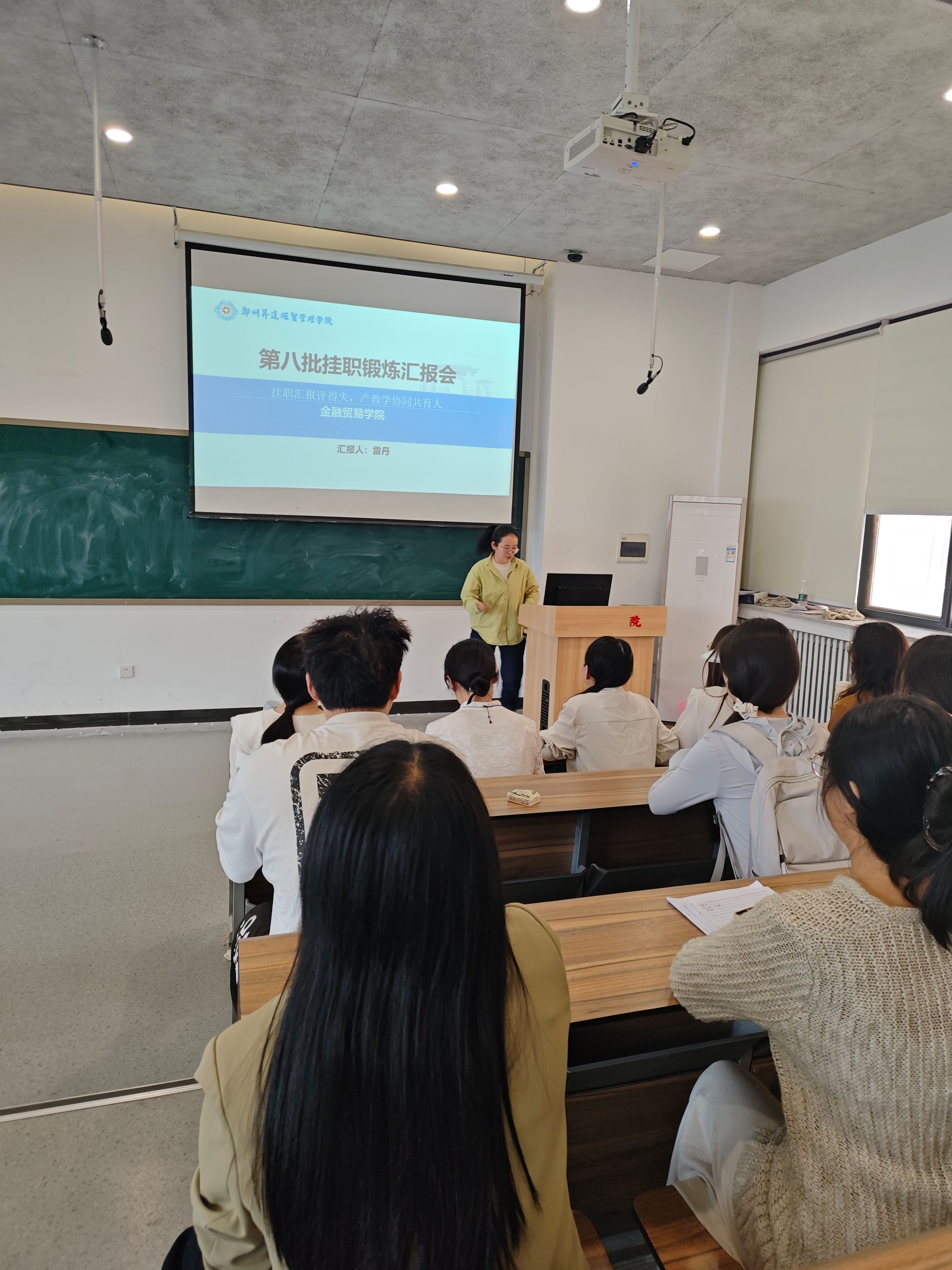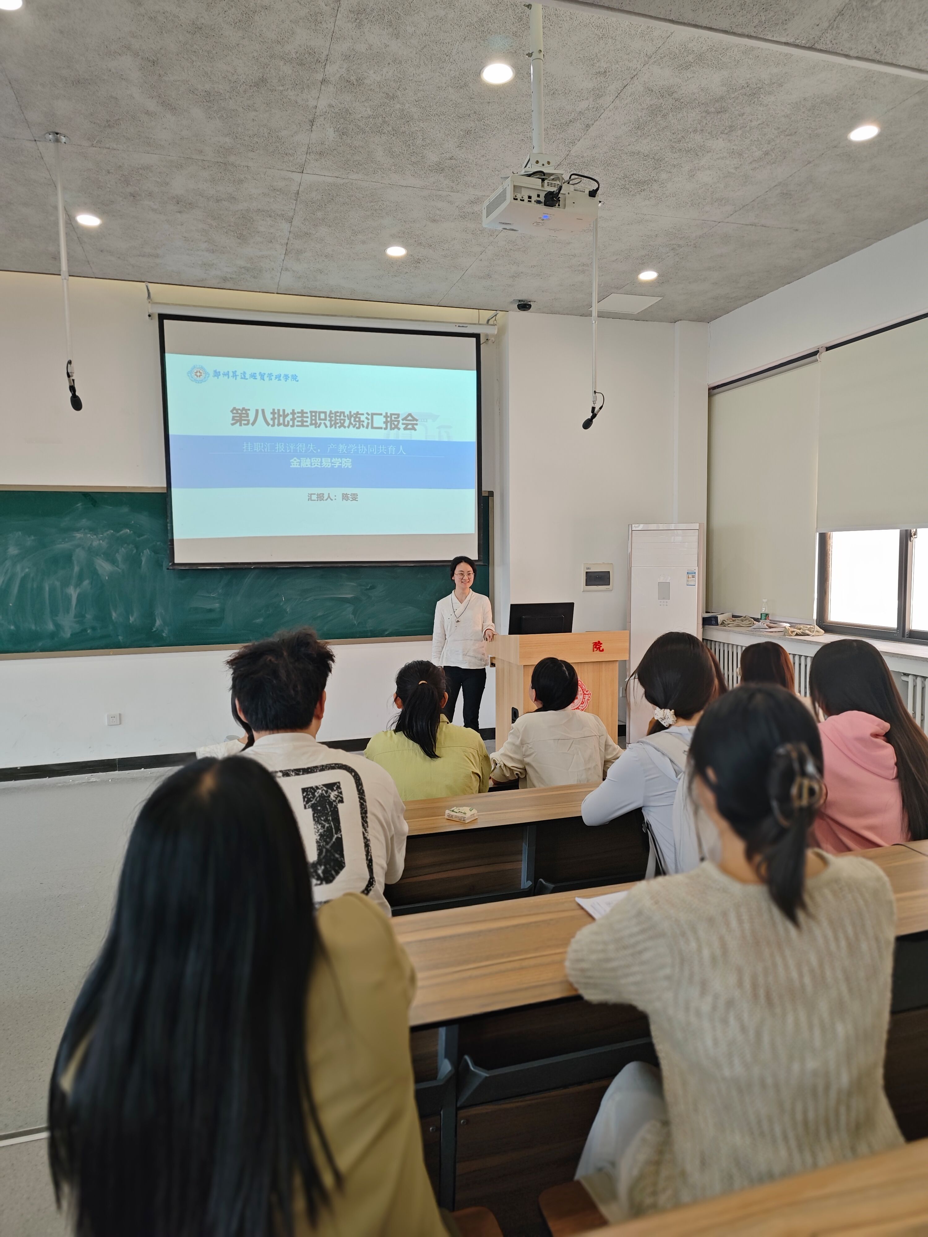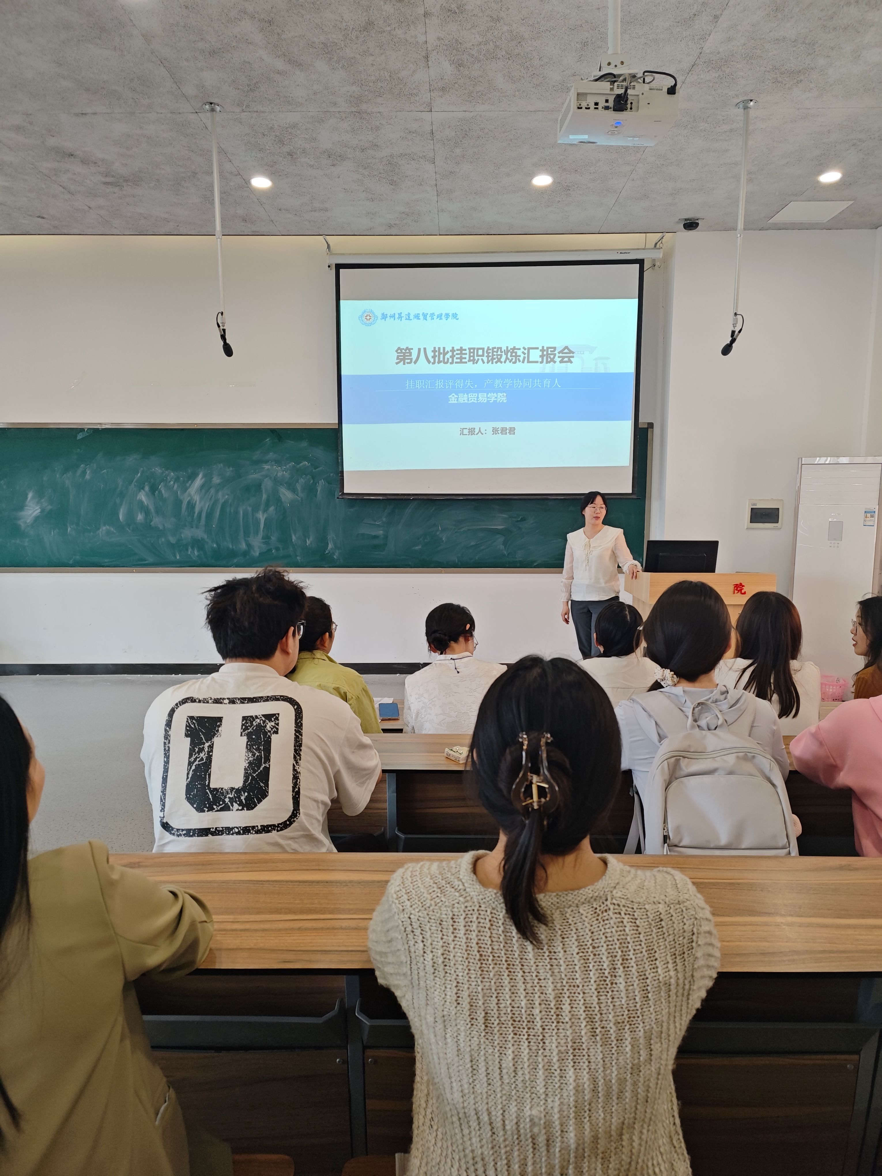 齐瑶涵老师分享了在河南铁字建筑工程有限公司挂职锻炼的经历。在该公司挂职期间主要在公司融资助理岗上完成企业融资相关工作,协助金融机构完成授信调查,落实公司融资方案等具体操作。通过企业挂职锻炼,获取企业金融融资的实际工作经验,将金融实务经验带回课堂,优化课堂教学案例,提升员工综合能力培养。