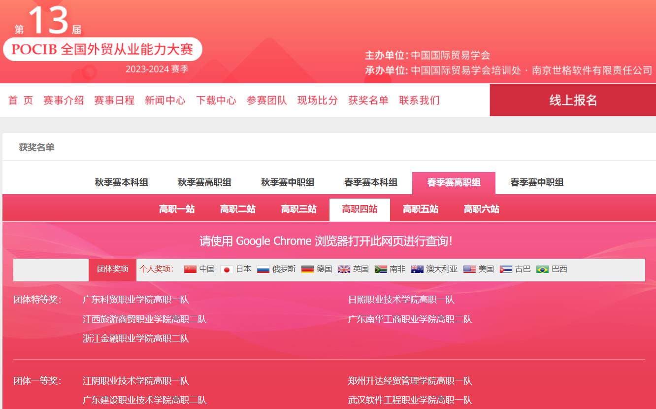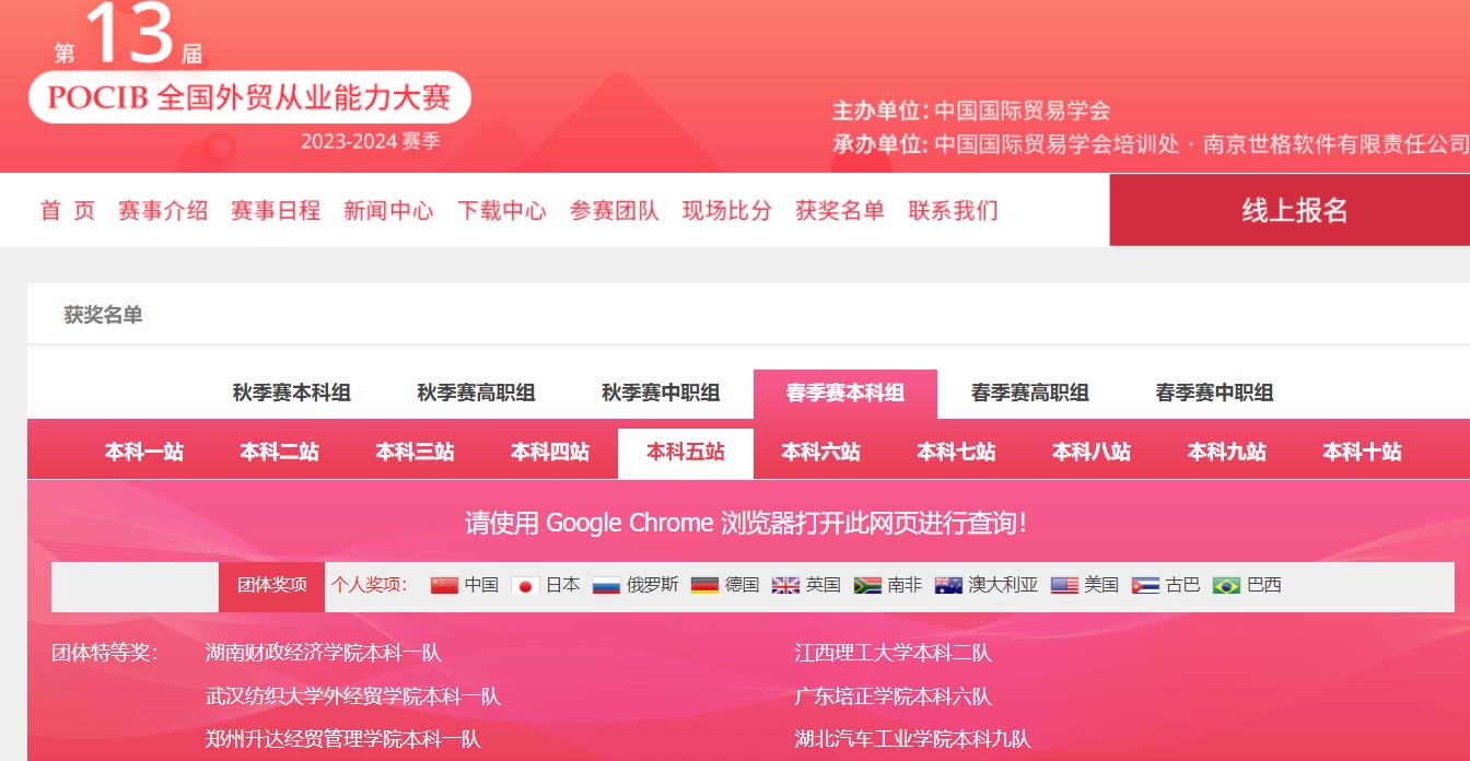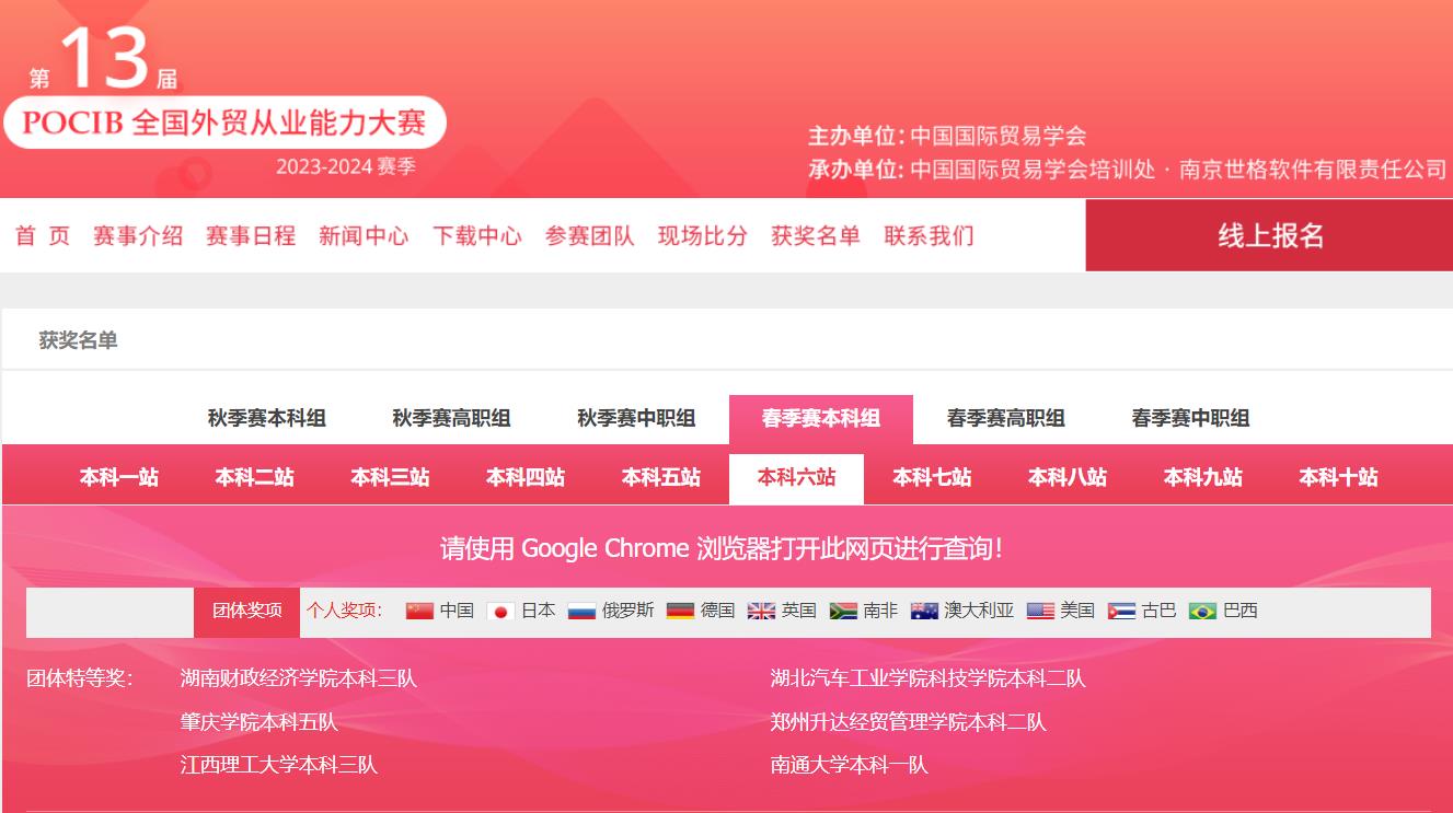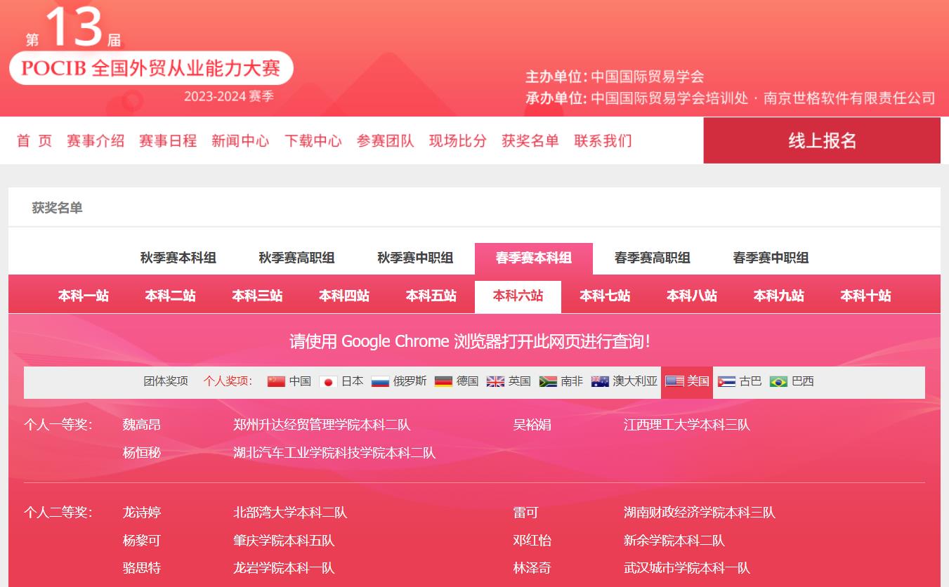 2024年4月19日上午10时,由中国国际贸易学会主办的“第十三届POCIB全国外贸从业能力大赛2023-2024赛季(春季赛)”正式落下帷幕。在beats365唯一官方网站国际贸易教研室王慧娟、徐书宜、李秋娟三位老师的指导下,公司两支本科参赛队伍、一支专科参赛队伍,共30名选手再创佳绩,两支本科队均荣获团体特等奖,专科队荣获团体一等奖。30名参赛选手中29名获得个人单项奖,其中,魏高昂同学以全赛站第一的成绩获得个人一等奖,赵薇柏、李毅博等18名同学获得个人二等奖,尚艳婷、李雨洁等10名同学获得个人三等奖。