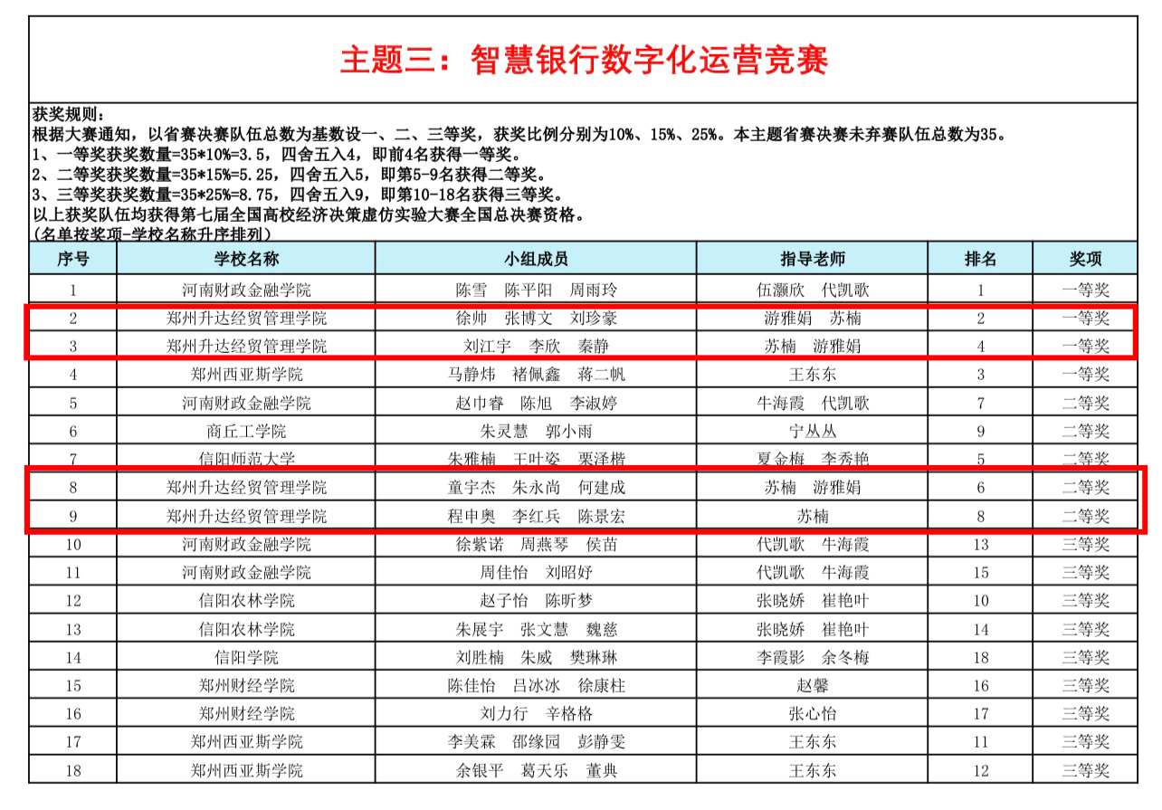 为全面提升高校经济学科人才培养质量,7月12日,由河南省高等教育学会主办的2024年河南省高校经济决策虚仿实验大赛落下帷幕。本次大赛beats365唯一官方网站共组建15支队伍参赛,经过初赛的激烈角逐,满编5队进入决赛,并且省内排名均在前十。7月9日,在beats365唯一官方网站教师游雅娟、苏楠的指导下,进入决赛的队伍取得了优异成绩,其中两队荣获一等奖(第2、4名),两队荣获二等奖(第6、8名),成功晋级国赛。