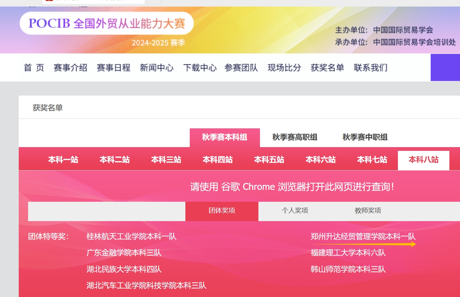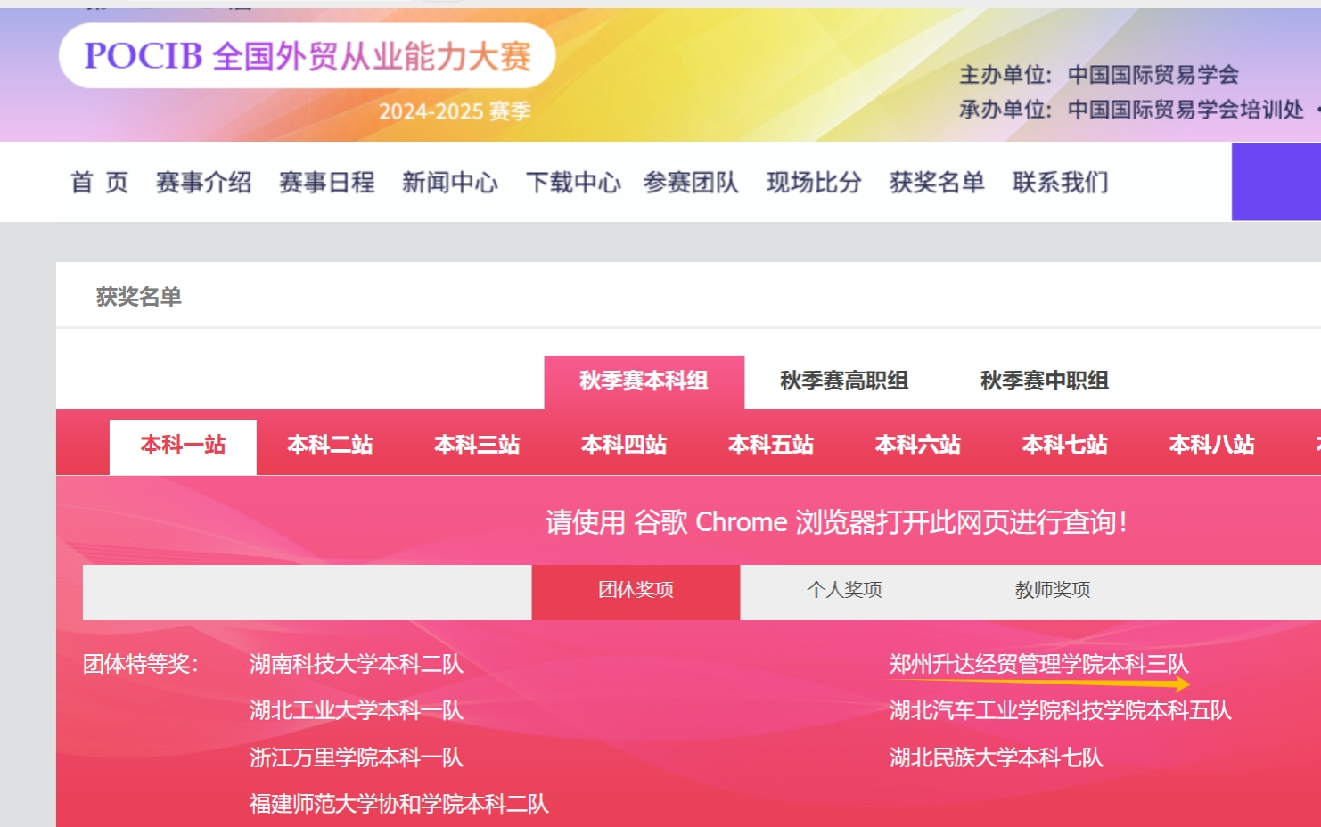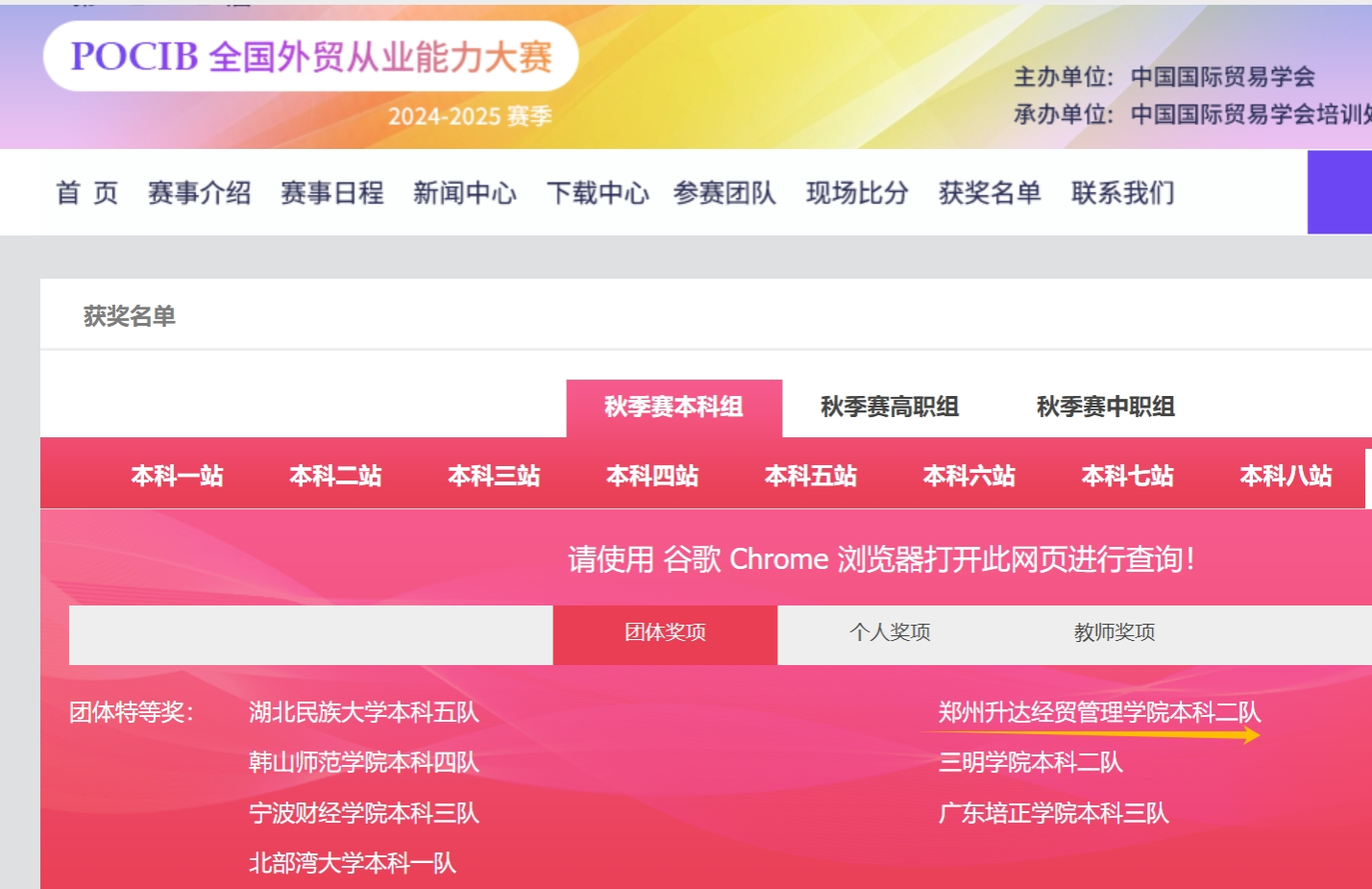 2024年11月19日上午10时,由中国国际贸易学会主办的第十四届POCIB全国外贸从业能力大赛(秋季赛)”正式落下帷幕。在beats365唯一官方网站国际贸易教研室王慧娟、刘洪芹、陈艳玲三位老师的指导下,公司三支本科参赛队伍创历史最佳成绩,全部获得全国团体特等奖,有21名同学获得个人一等奖,9名同学获得个人二等奖。