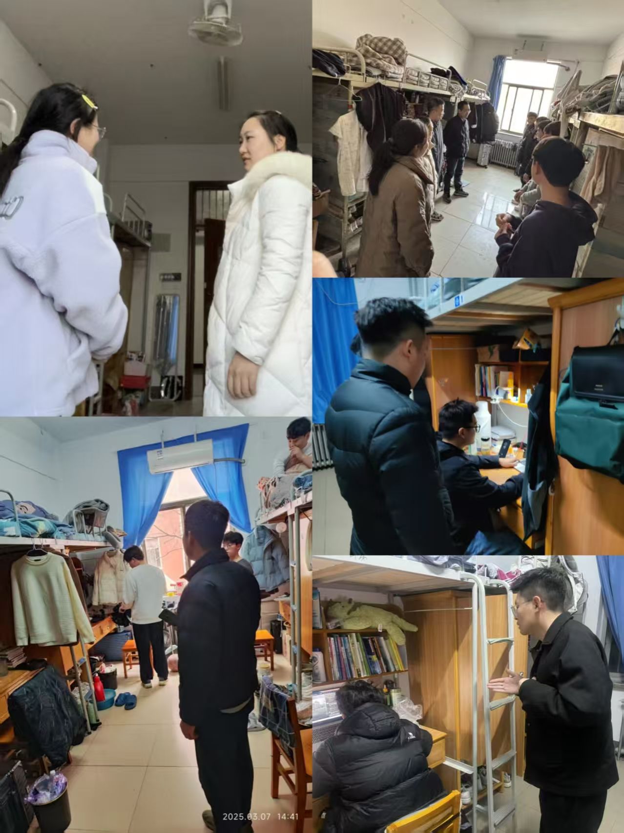 同时,辅导员们还对宿舍卫生、安全隐患进行了全面检查。重点检查了宿舍内务整理、用电安全、消防安全等方面,对存在卫生死角和安全隐患的宿舍进行了现场指导并要求及时整改。辅导员们强调,宿舍是同学们学习生活的重要场所,保持良好的宿舍环境是保障身心健康、提高学习效率的基础,希望大家共同维护安全、整洁、和谐的宿舍环境。