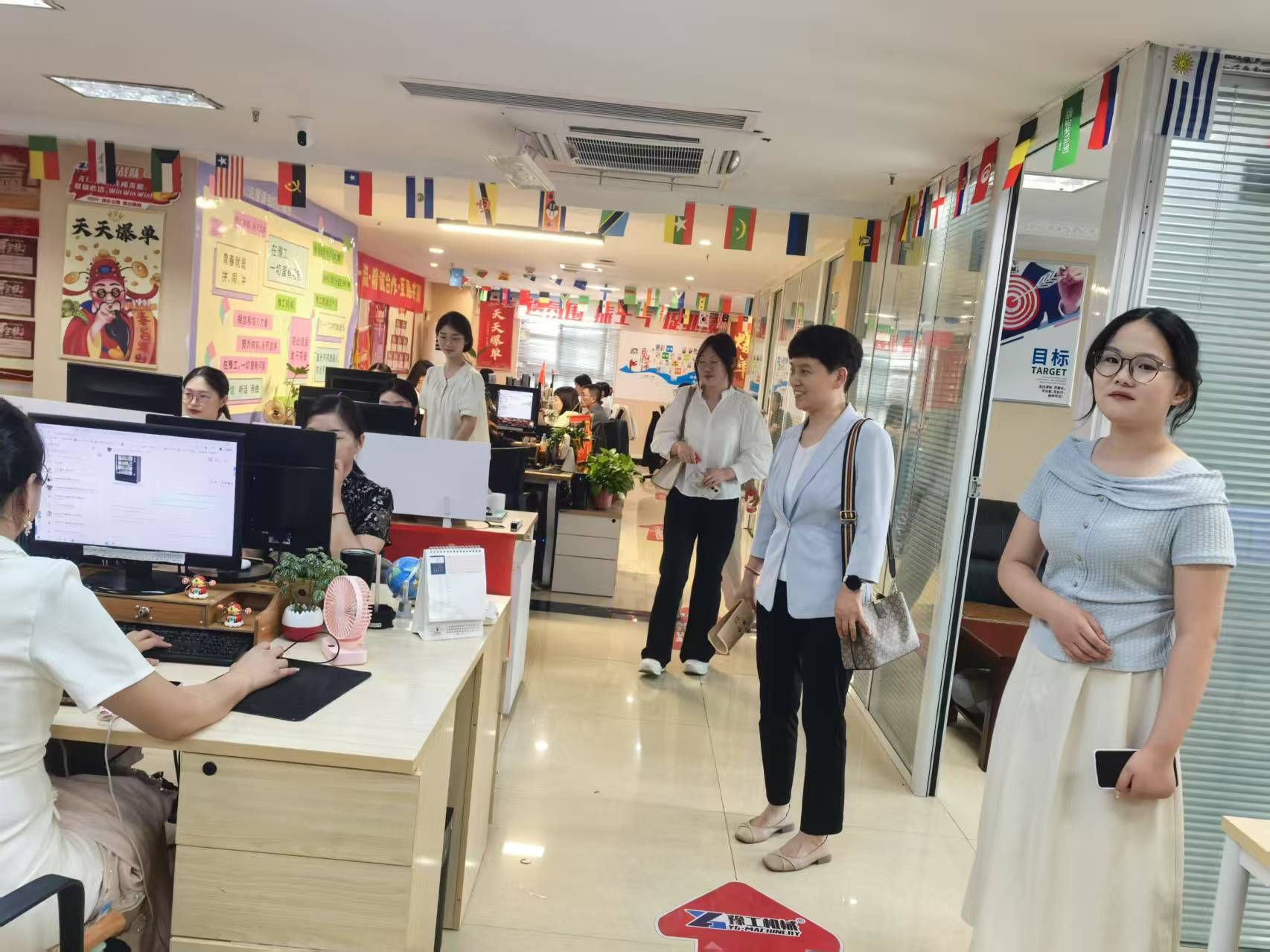 座谈会后,在刘军伟总监的陪同下,师生一行参观了河南豫工机械有限公司的外贸业务部门。通过现场观摩和听取介绍,师生详细了解了公司业务团队、运营团队的日常运作流程、主要贸易平台的应用、客户开发与维护模式、以及外贸团队的工作环境和企业文化氛围。这为公司进一步优化课程设置、提升实践教学质量提供了宝贵的一手资料。