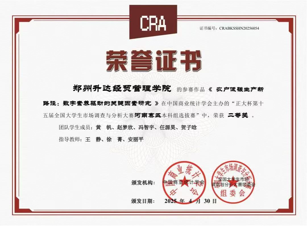 近日,第十五届全国老员工市场调查与分析大赛落下帷幕,经过激烈角逐公司学子组成的参赛团队凭借作品《农户低碳生产新路径:数字素养驱动的关键因素研究》荣获河南省省赛二等奖。