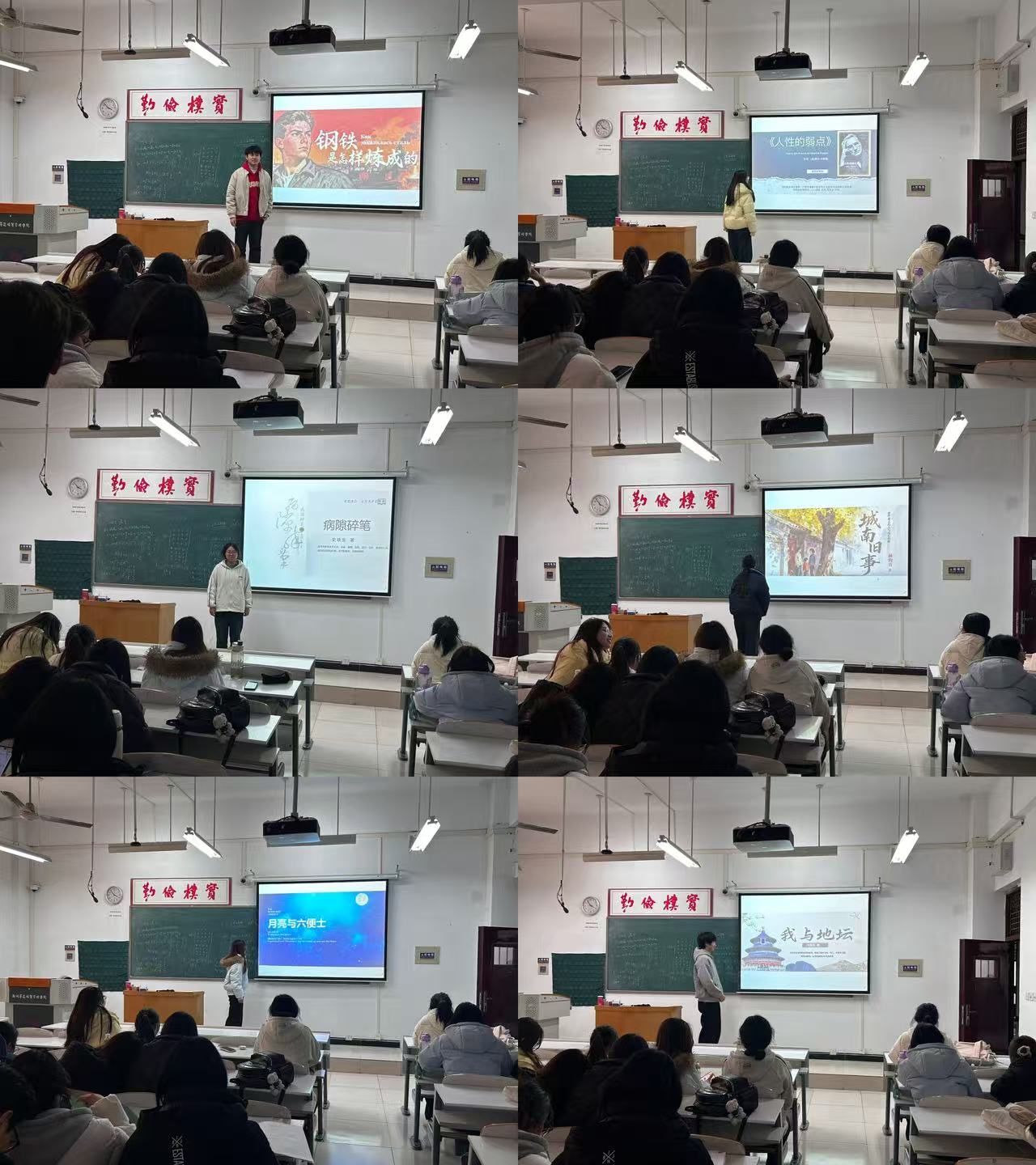 随后,班级读书分享会正式拉开帷幕。同学们纷纷上台,热情洋溢地分享了自己喜欢的书籍。裴浩兵同学以《钢铁是怎样炼成的》为例,深情讲述了保尔·柯察金在艰苦的革命斗争中展现出的顽强意志、为理想而献身的精神,让同学们深刻感受到了信念的力量与自我超越的重要性,深受触动;王英姿同学则带来了《月亮与六便士》,展现了一个理想与现实激烈碰撞的世界,让同学们对人生追求和自我价值实现有了更深入的思考;李静美同学拿起《病隙碎笔》,让同学们在倾听中,对生命的坚韧与意义有了全新的认知;张向涵带来了《人性的弱点》,结合书中的经典案例和实用建议,讲述了如何更好地与人相处、提升人际交往能力,让同学们明白了理解他人、尊重差异在人际交往中的关键作用;刘沛同学的《我与地坛》分享,从史铁生与地坛的不解之缘出发,讲述了他在地坛的所见所闻所感,更是让大家对人生的价值与意义有了更深刻的思考;刘倩倩带来了《城南旧事》,通过细腻的文字和生动的叙述,展现了一个充满温情但又略显残酷的世界,让同学们对那个时代人们的生活状态和人性的复杂多面有了更深入的了解。