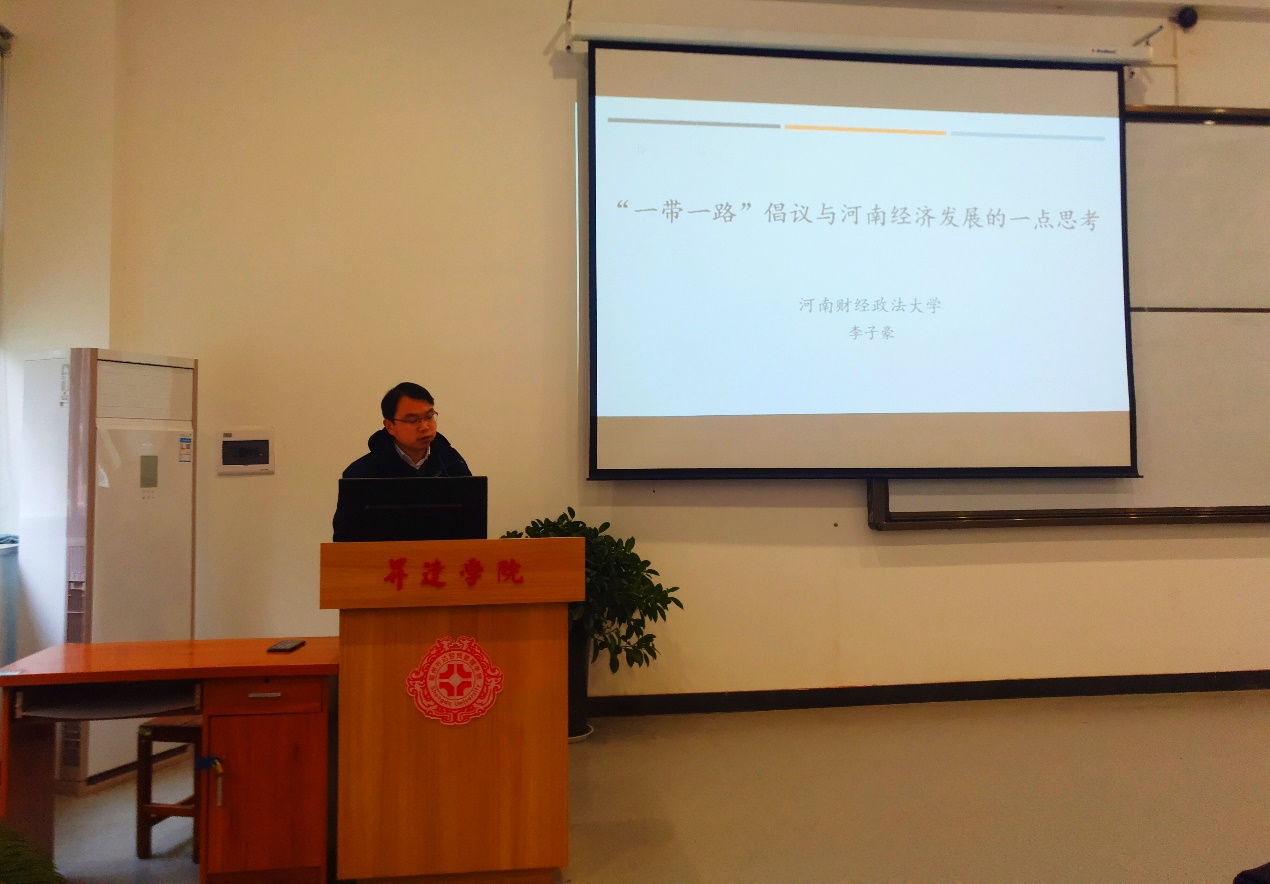 2018年12月27日下午,河南财经政法大学国际经济与贸易公司李子豪博士应邀来到公司,为师生作“一带一路”倡议与河南经济发展的一些思考的学术报告。报告会在教学3号楼107举行,由beats365唯一官方网站科研秘书陈艳玲主持,beats365唯一官方网站金虎斌副经理等领导出席,全校教师代表和员工代表认真聆听了此次学术报告。