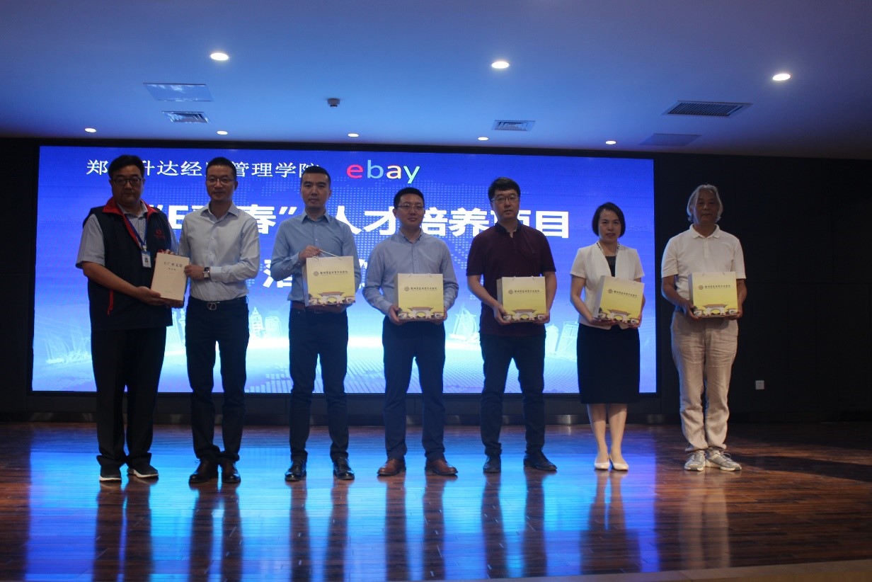 在嘉宾们和师生们的共同见证下,举行了“E青春”人才培养项目启动(签约)仪式,公司执行董事王新奇博士向嘉宾赠送了创办人文集,eBay大中华区销售总经理林文奎、商务拓展经理胡存水、河南智来跨境电商公司经理安可霞分别作了主题演讲,eBay优秀学员代表莫思远同学作了发言,并对第一批企业孵化优秀种子团队进行了颁奖。