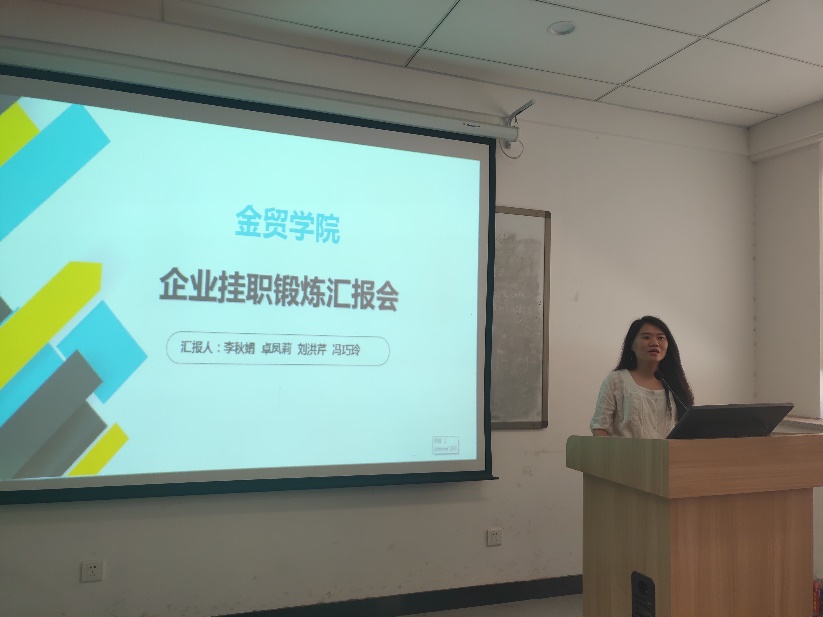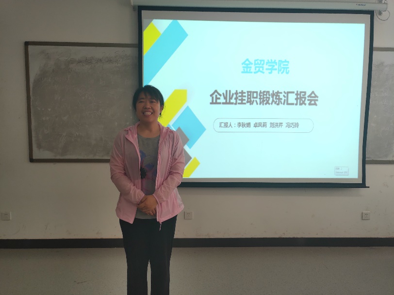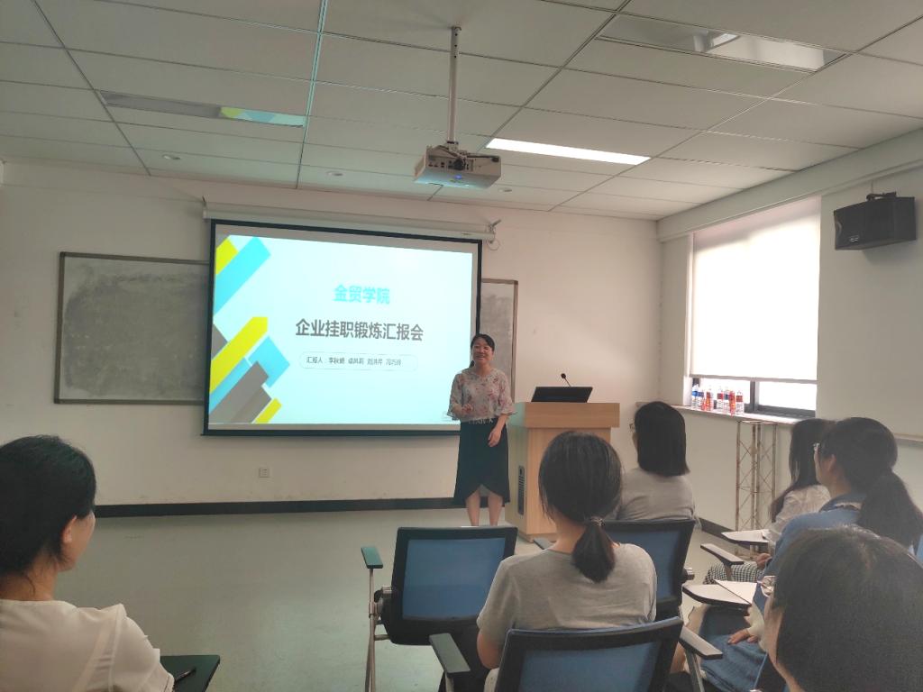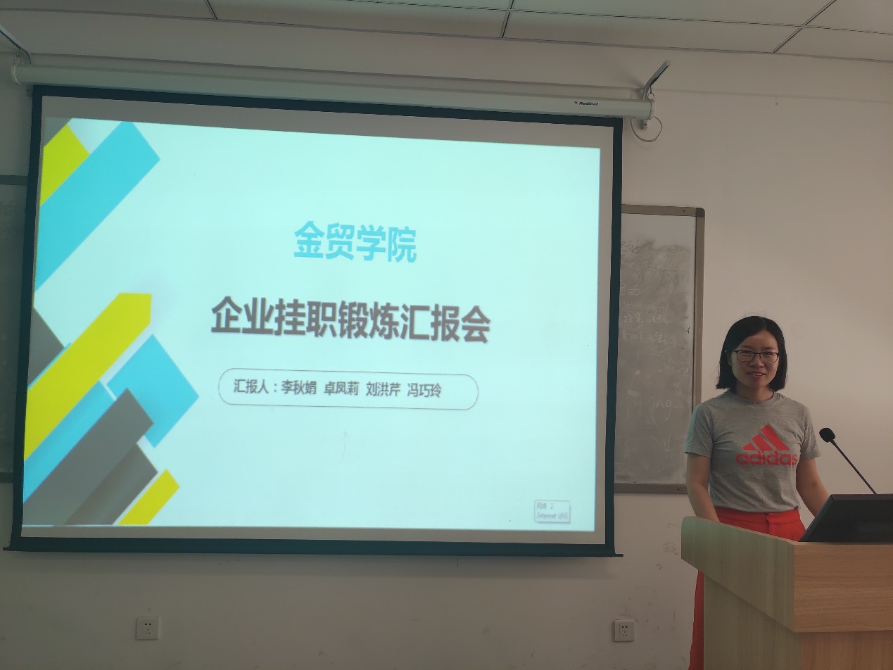 本学期,为更好地做好产教融合、协同育人的总结工作,金贸公司在第一次挂职锻炼总结会基础上(周辉、王宇鹏、李光举等三位教师在郑州融e聚公司挂职锻炼),于2019年6月13日上午在教学3号楼111会议室举行了第二次挂职锻炼教师汇报会,国贸专业的李秋娟老师、卓凤莉老师、刘洪芹老师和金融专业的冯巧玲老师分别向大家分享了她们在不同单位挂职锻炼的经验、收获和感受。