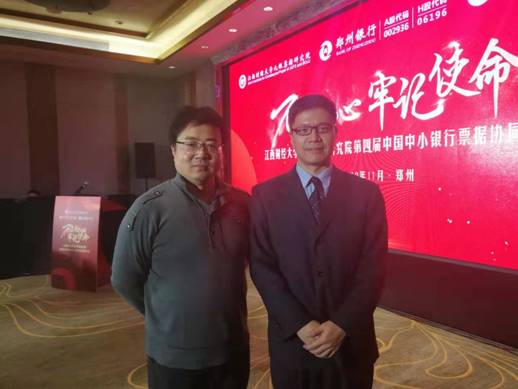 2019年11月22日,金贸公司耿广奇和吕素昌老师应邀参加中国中小银行票据协同发展论坛“不忘初心、牢记使命,中小银行票据服务实体经济”研讨会议。该会议由江西财经大学九银票据研究院在郑州主办,郑州银行、九江银行共同承办。上海票据交易所代表、承办银行的主管行长、全国50余家中小银行票据业务负责人及郑州各家商业银行票据业务负责人参加。