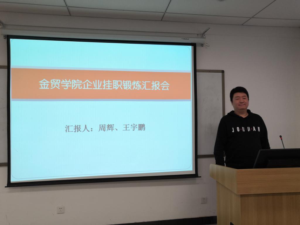 2019年12月20日上午,金贸公司在3号楼213举办了第四批挂职锻炼教师汇报会,金融教研室教师周辉老师与王宇鹏老师向金贸公司教师介绍了他们的挂职锻炼情况。