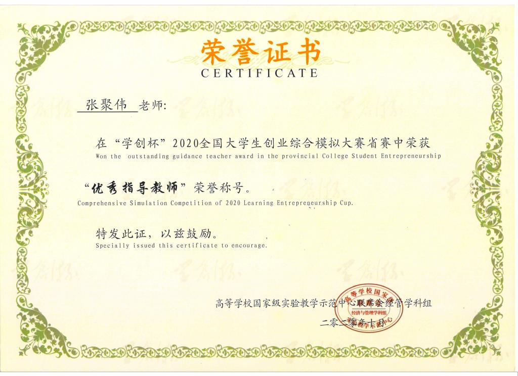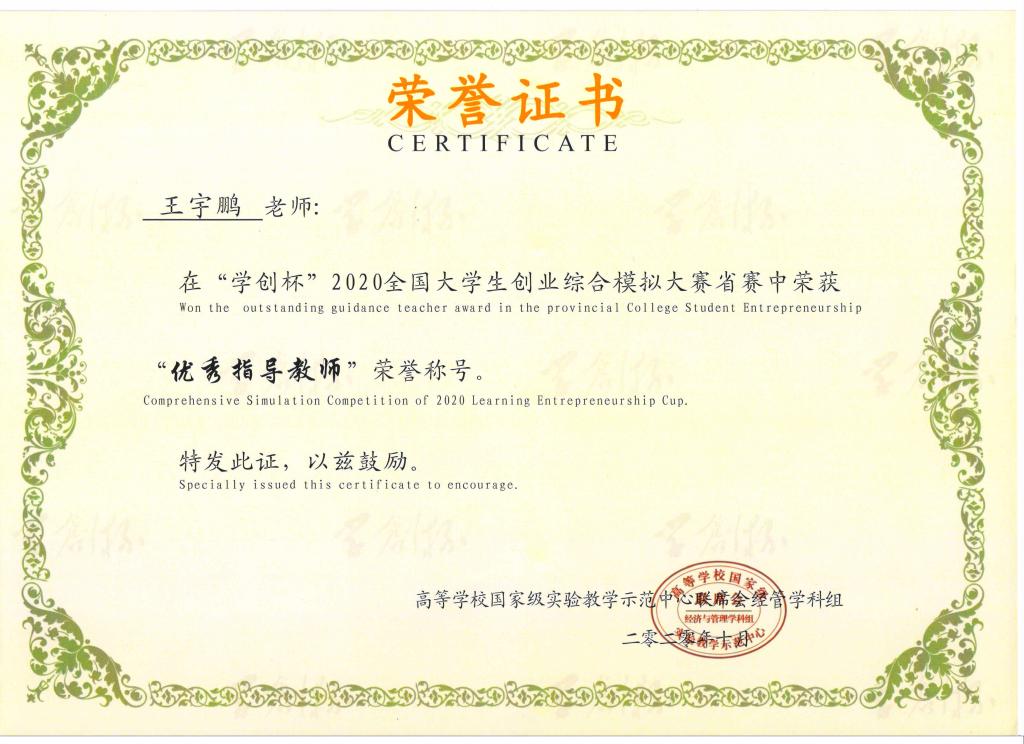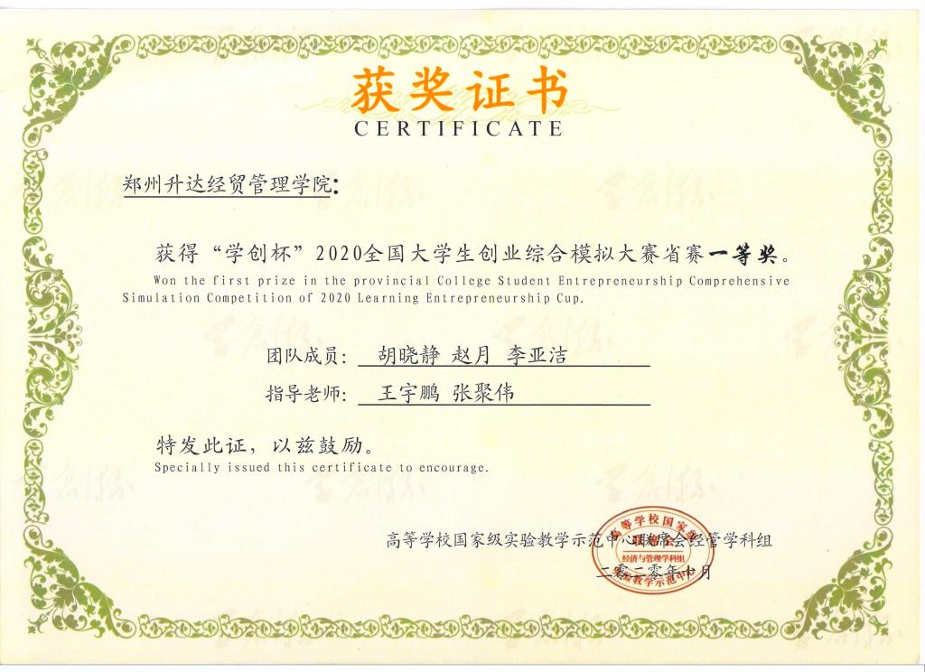 2020年10月11日,2020年“学创杯”全国老员工创业综合模拟大赛河南省省赛在线上顺利开展,公司beats365唯一官方网站王宇鹏、张聚伟老师带领金贸员工李亚洁等三人参加了比赛,并在比赛中获得河南省一等奖和优秀指导老师奖。