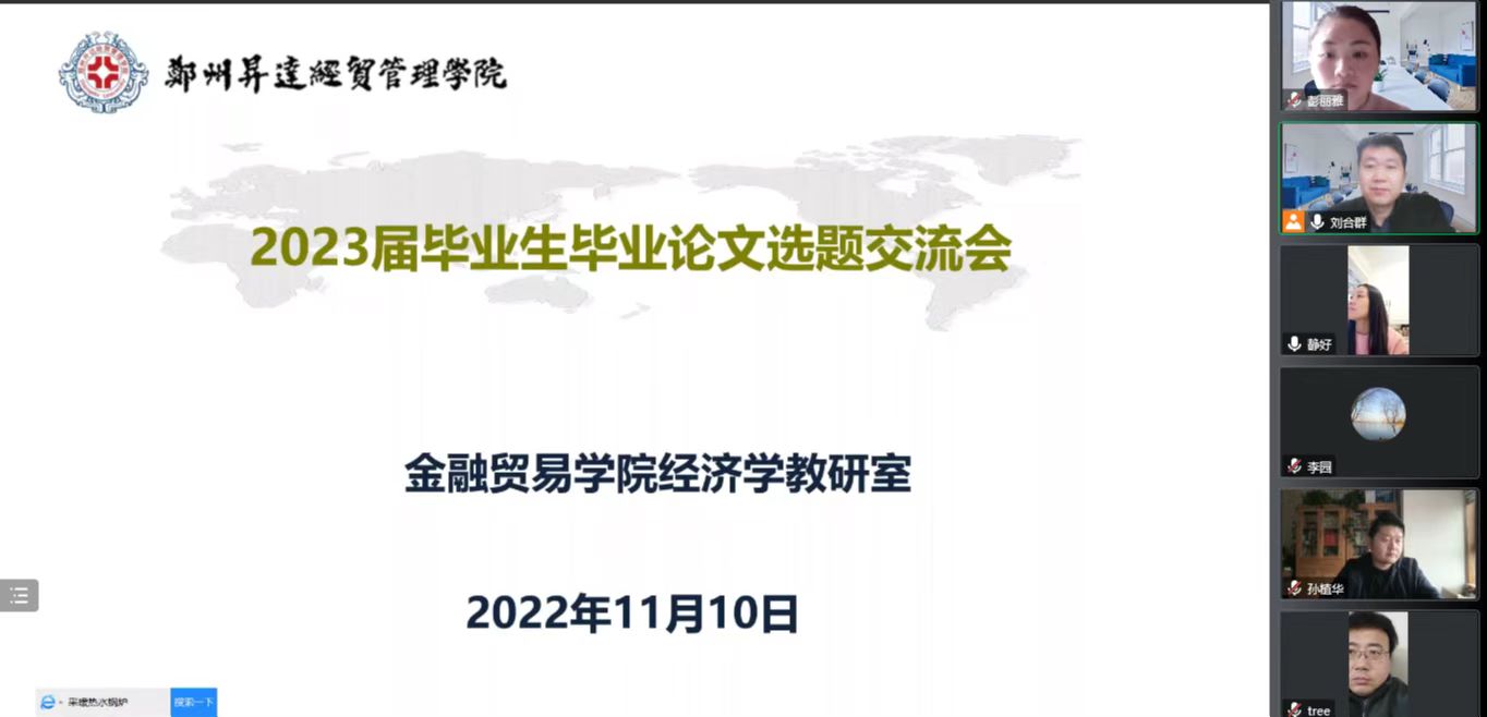 2022年11月10日13:30,经济分析与创业管理教研室(简称经济学教研室)召开2023届经济学专业毕业论文选题交流会。因疫情原因,会议以腾讯视频会议的形式开展,会议由经济学教研室主任刘合群主持,全体教师参加了本次会议。