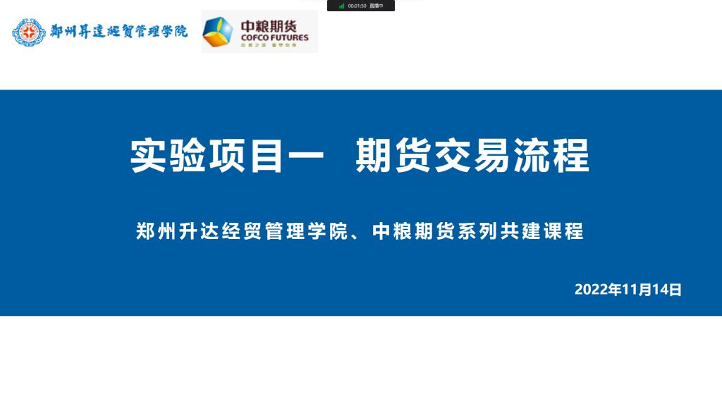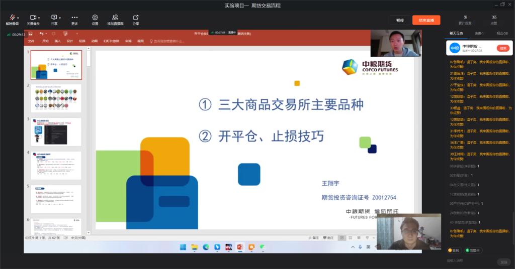 2022年11月14日,共建的第一门课程《期货与期权》于钉钉直播平台正式开讲,主讲人为中粮期货华中区资产管理负责人、期货势赢交易团队资深分析师王翔宇和公司温子奕老师。课上,王老师对郑州商品交易所、大连商品交易所和上海期货交易所的主要期货品种合约内容及特点展开讲解,并以花生期货讲解期货合约细节以及实战中的开平仓技巧。其中,开仓技巧主要讲解了技术指标开仓法、技术形态开仓法、涨跌幅筛选法、市场消息开仓法、多周期共振筛选法,平仓技巧主要讲解了固定盈亏比法、跟踪止盈止损法、技术指标平仓法、时间平仓法、整体权益参考法。温老师则向同学们讲解了期货投资模拟教学系统的使用。同学们在两位老师的带领下展开了期货模拟交易操作,理论与实践相结合,收获满满。