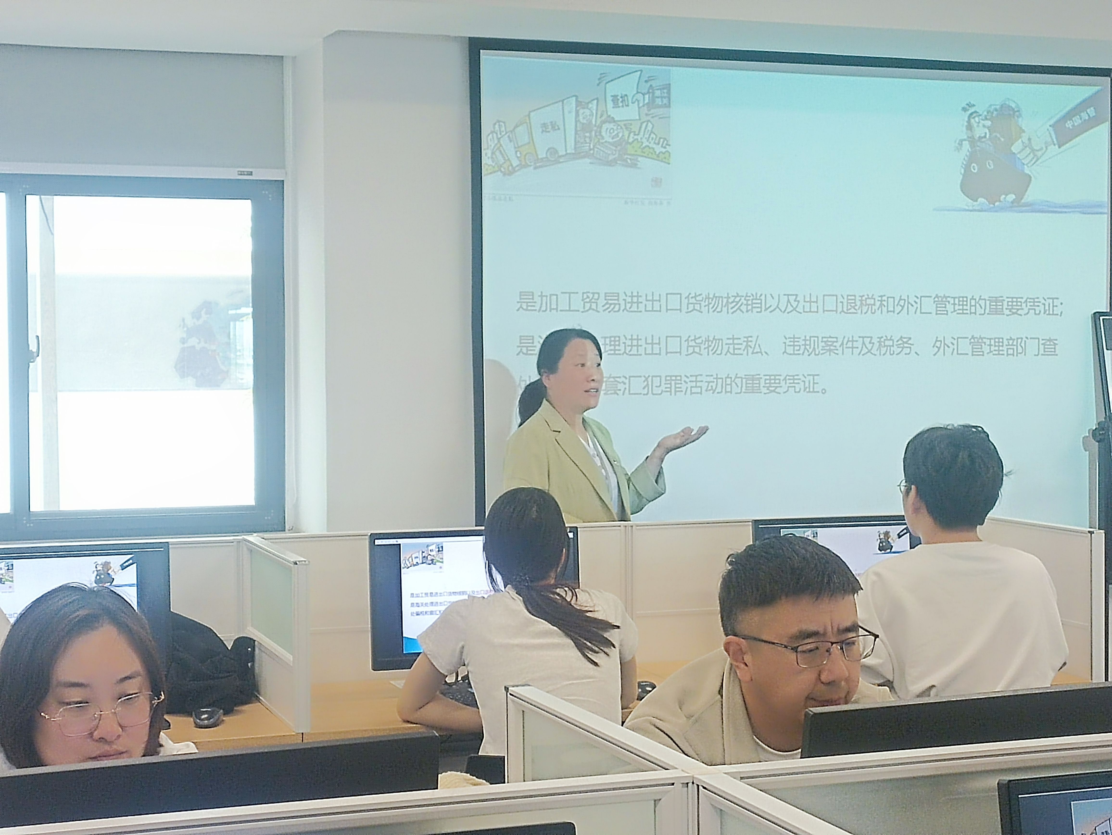 刘洪芹老师讲授的内容是报关单的填写,采用的教学方法是案例教学、混合式教学和讨论式教学。陈老师首先在开始讲授前,检查了课后布置的线上预习任务,通过课前测试了解员工的知识盲区,接着通过讨论引入海关和报关的含义,通过海关的监管职能引入报关单填制的要点。